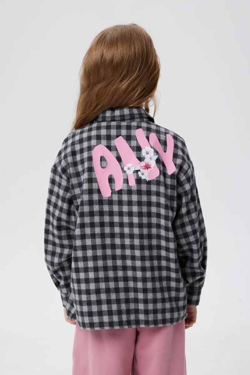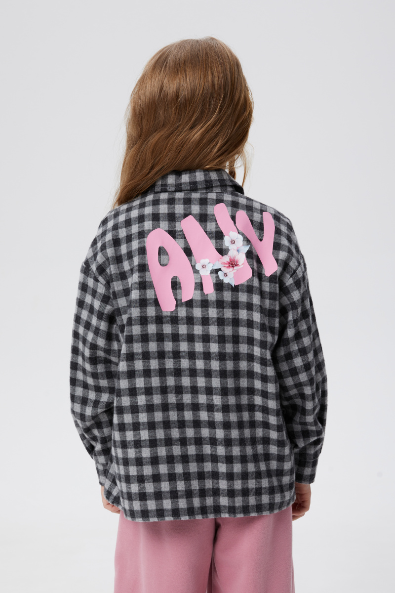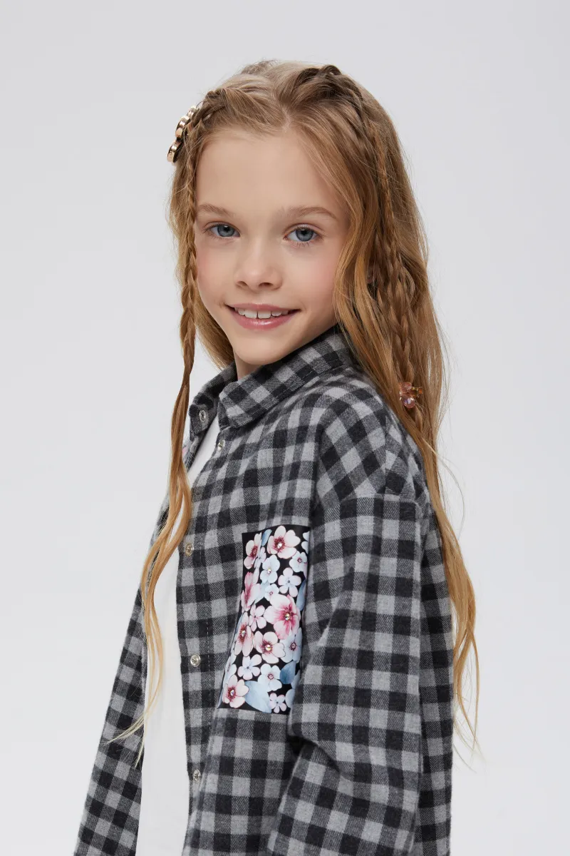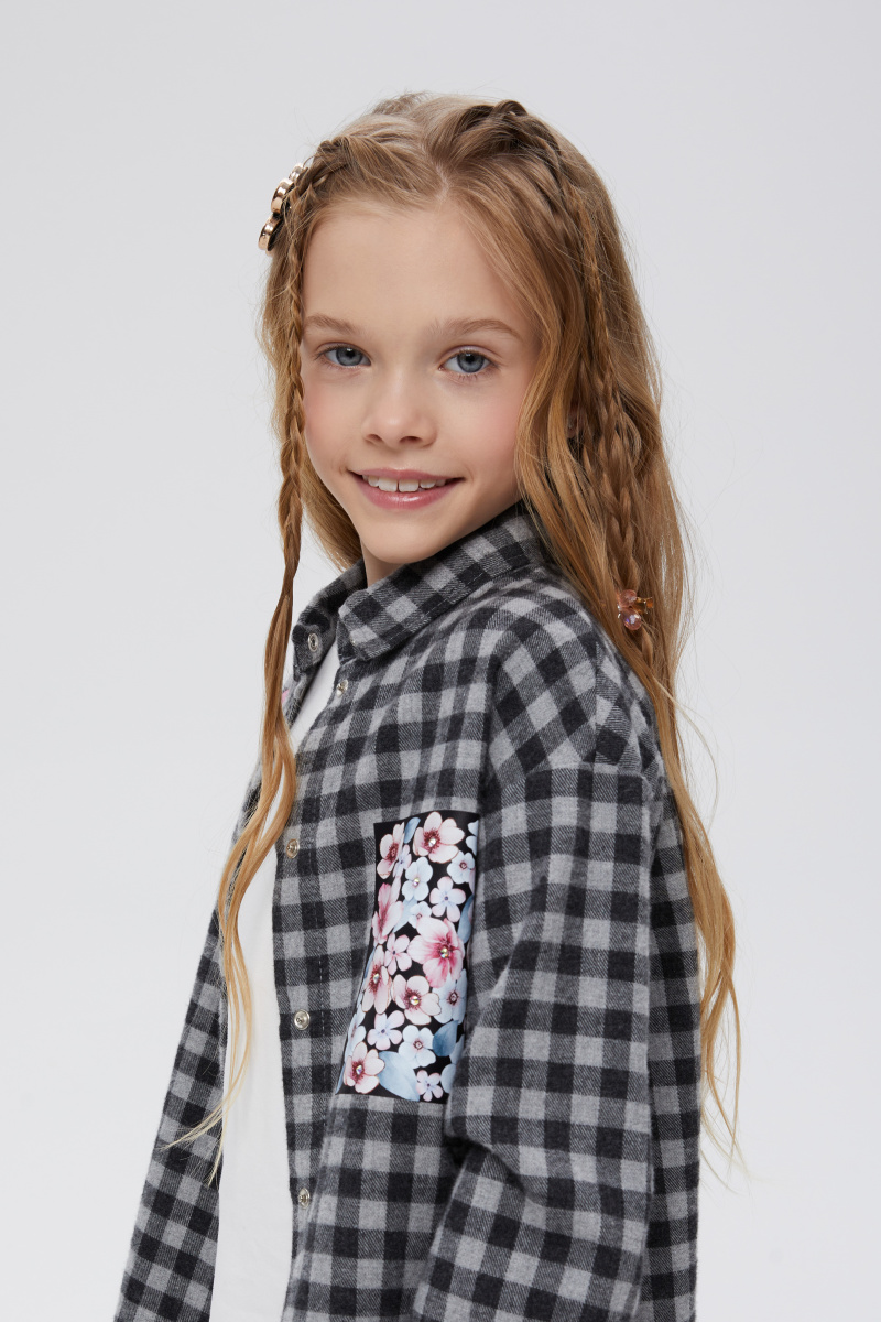 Стильная рубашка в клетку для девочки. Прямая модель. Длинный рукав со спущенной линией плеча. Комфортная застёжка на кнопки. Рубашка декорирована авторскими печатями, в том числе и современной DTF, стразами. Декоративная имитация кармана.