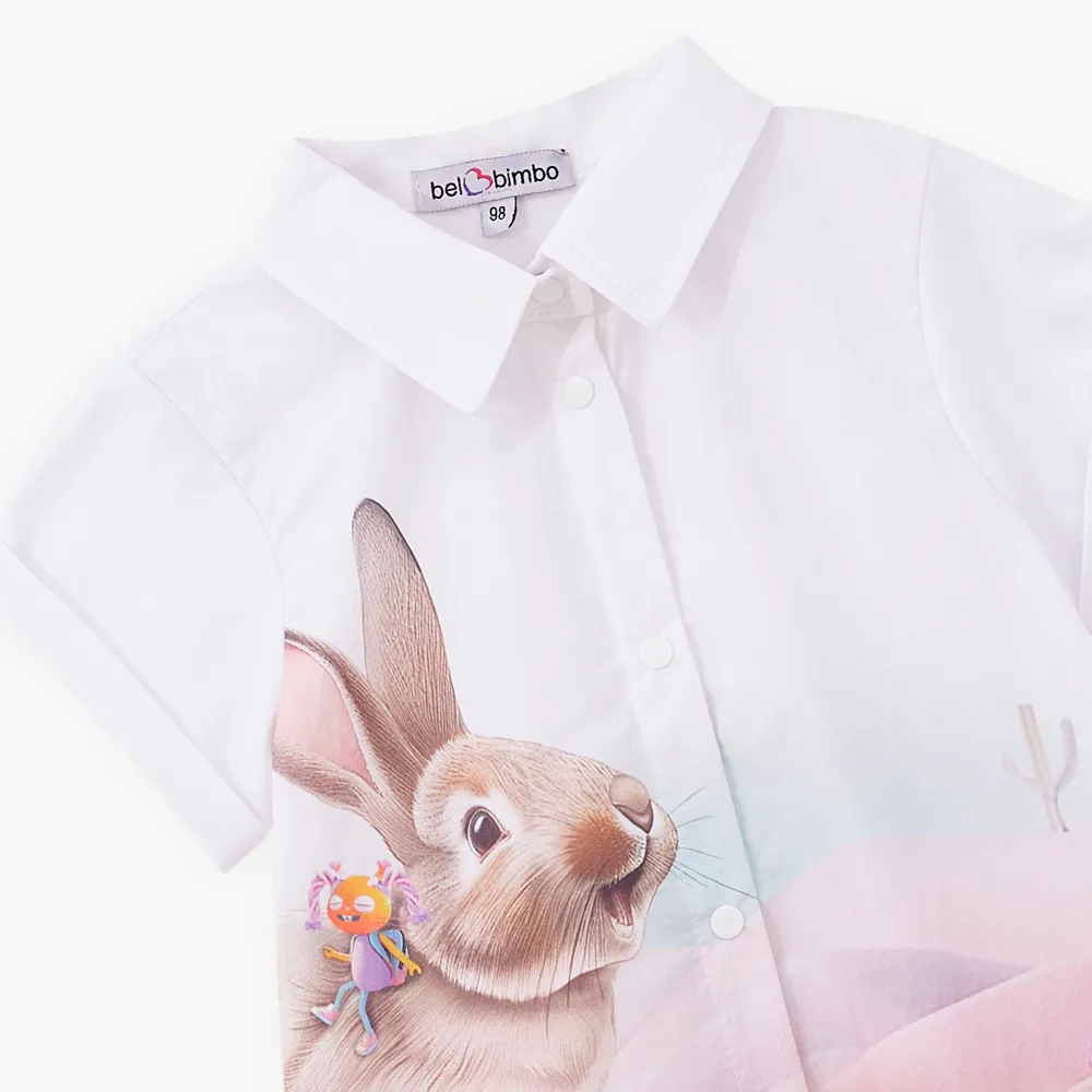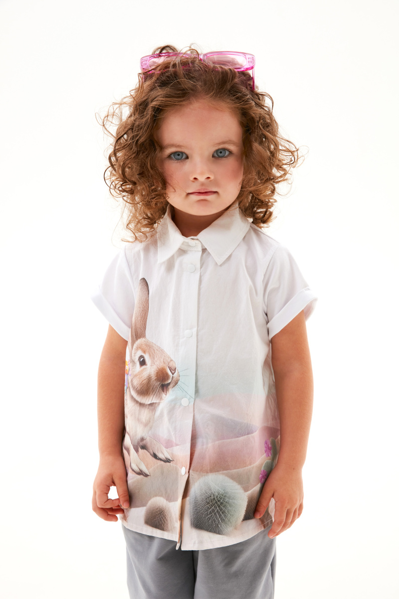 Дизайнерская блузка для девочки. Модель комфортного трапециевидного силуэта. Комфортная застёжка на кнопки. Блузка из поплина с эффектом "жатости", что придаёт оригинальный внешний вид и не требует глажки. Авторский принт.