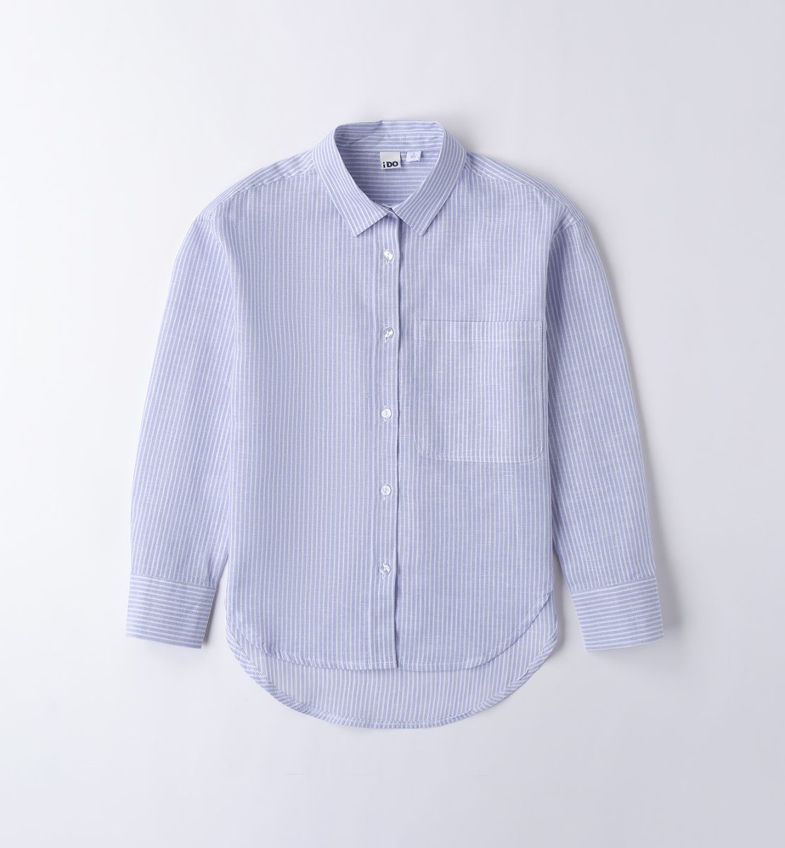 Рубашка в полоску для девочек от итальянского бренда iDO. Модель с воротником стойкой и настрочной планкой спереди, спинка ассиметричная. Отличный вариант для создания casual образов!