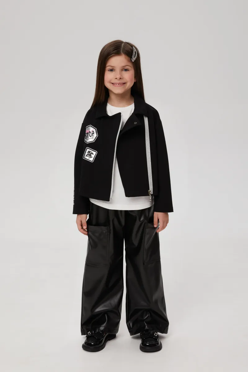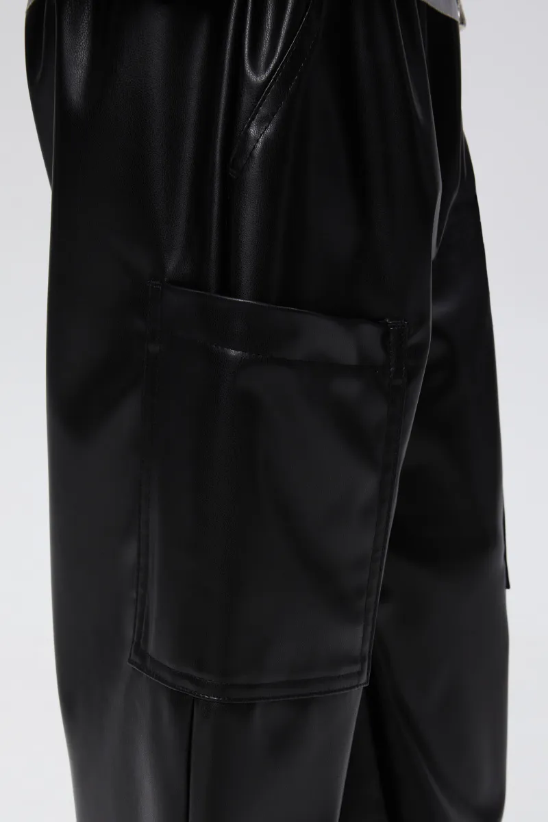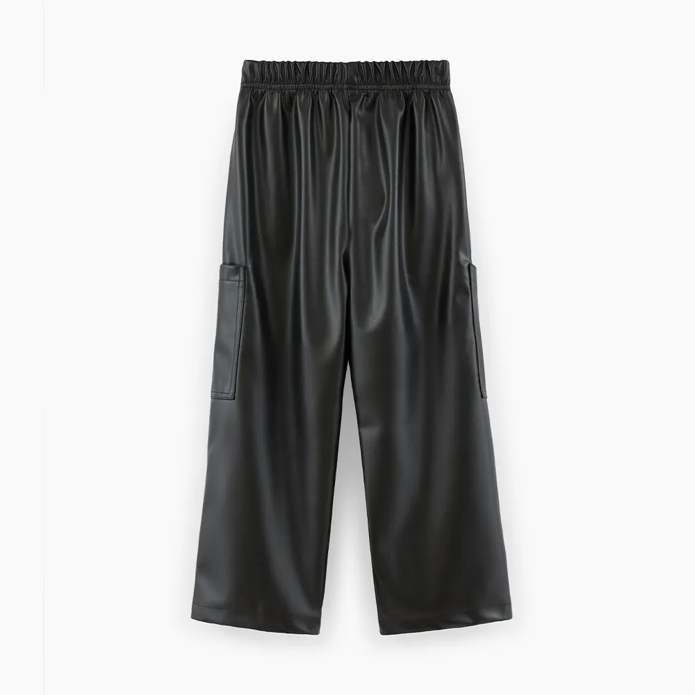 Чёрные брюки-карго из эко-кожи для девочки. Прямая широкая модель со средней посадкой. Изделие без застежки, на мягком эластичном поясе. Брюки дополнены вверху карманами-хулиганами и большими боковыми накладными в области колен.
