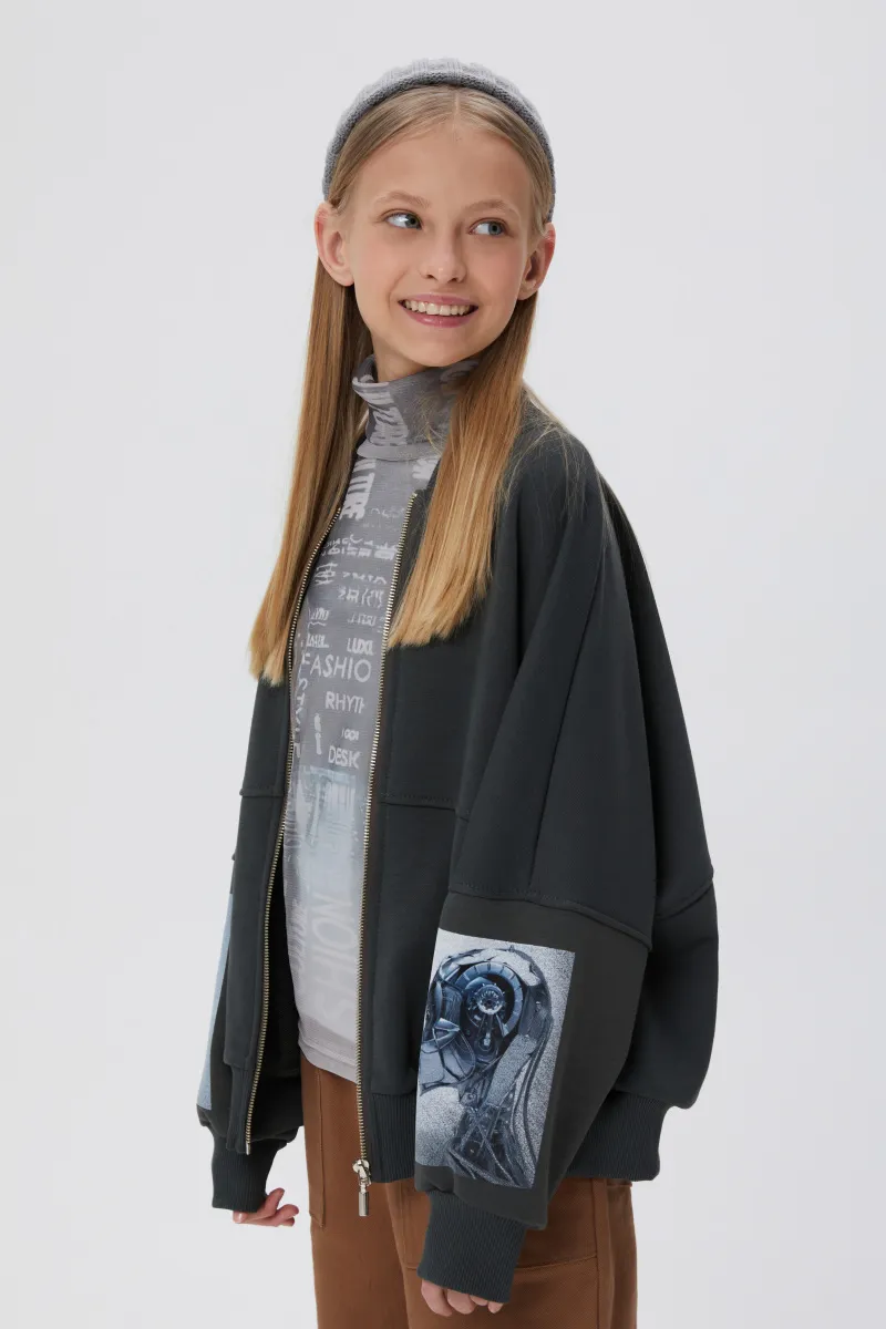Жакет-бомбер глубокого оттенка тёмный лес для девочки. Объёмная модель О-образного силуэта. Воротник-стойка, манжеты и низ изделия из эластичной рибаны. Комфортная застёжка на молнию. Жакет декорирован авторскими цифровыми и трансферными печатями.