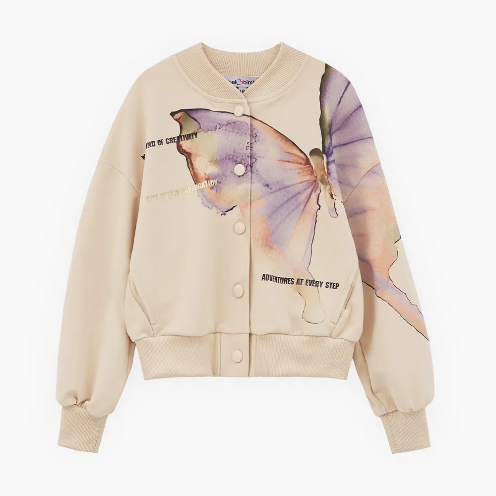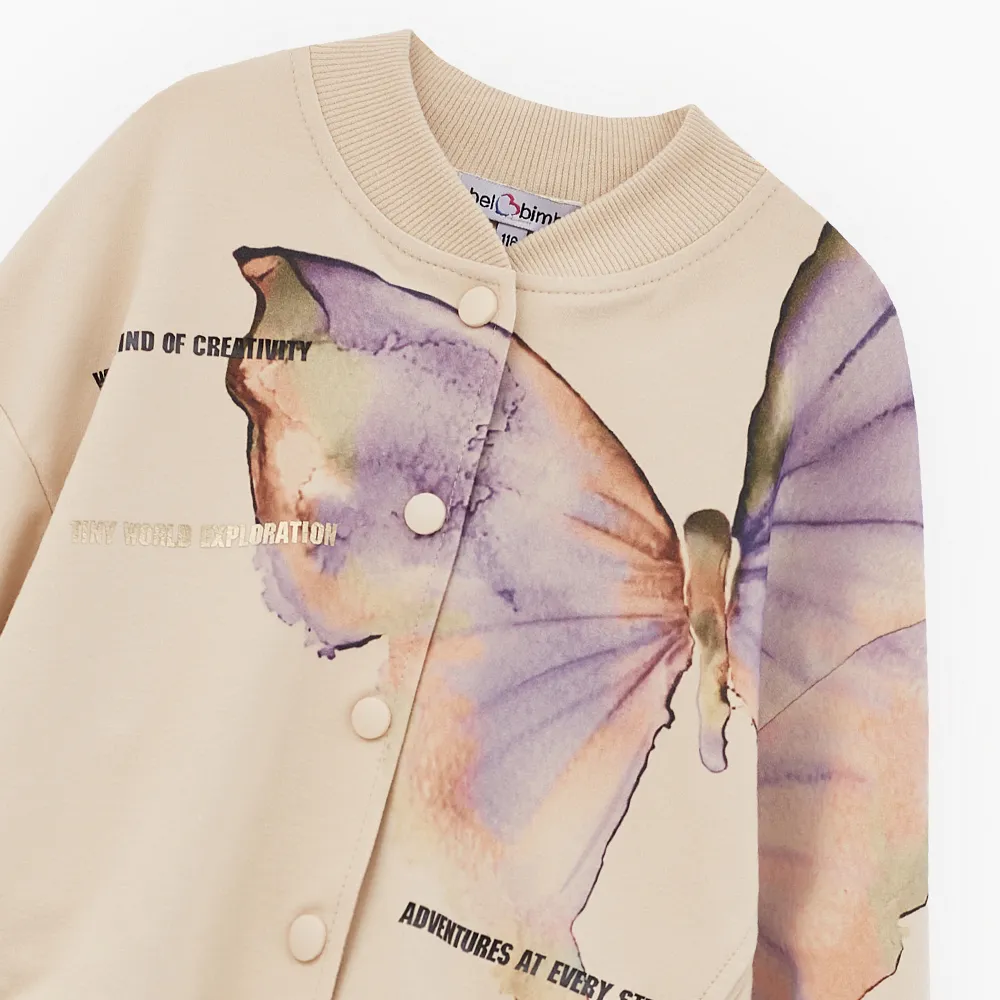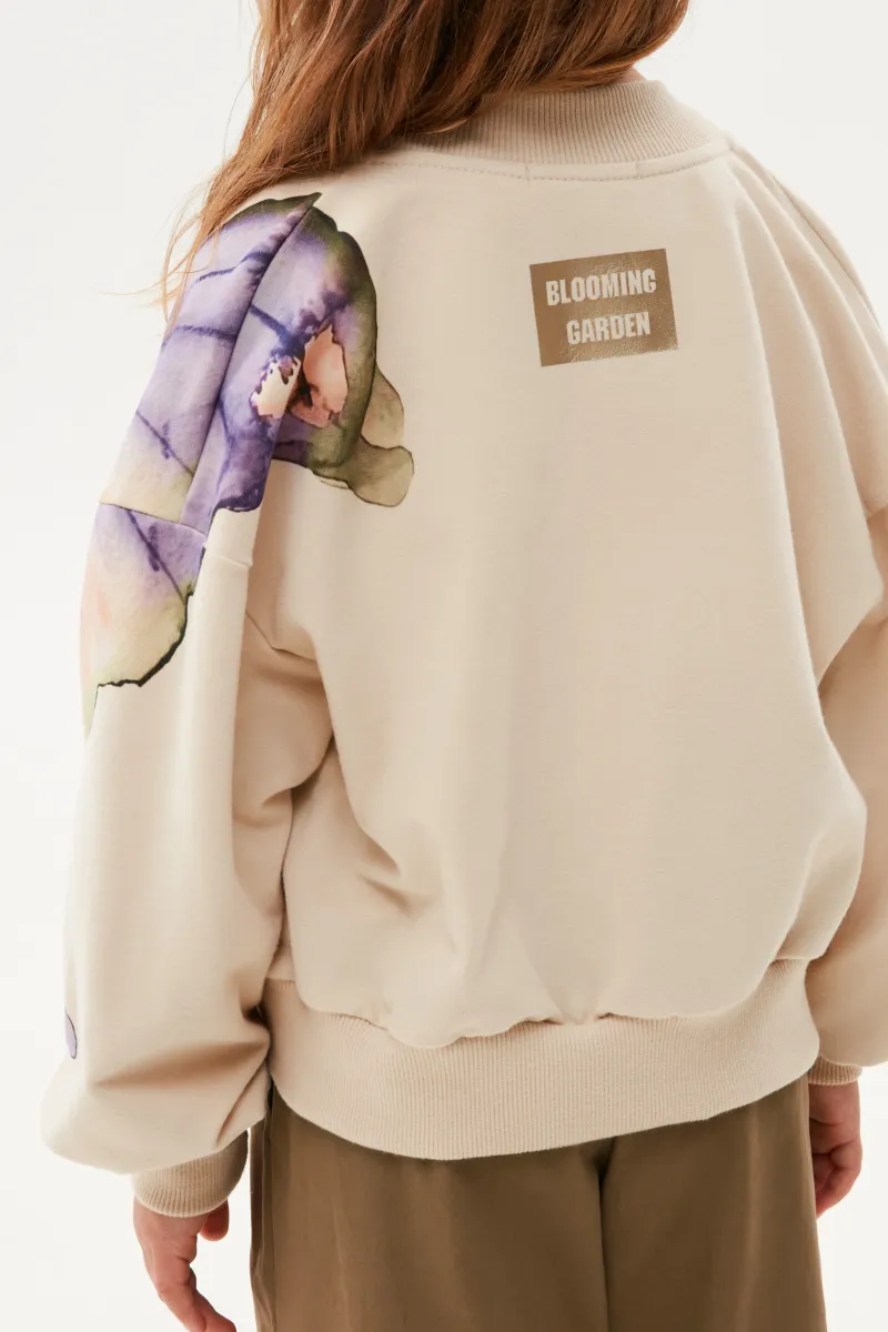 Укороченный жакет-бомбер оттенка экрю. Прямая свободная модель со спущенной линией плеча. Воротник-стойка, манжеты и низ изделия из эластичной рибаны. Застёжка на кнопки. Жакет из футера с бархатистым эффектом декорирован авторскими принтами.