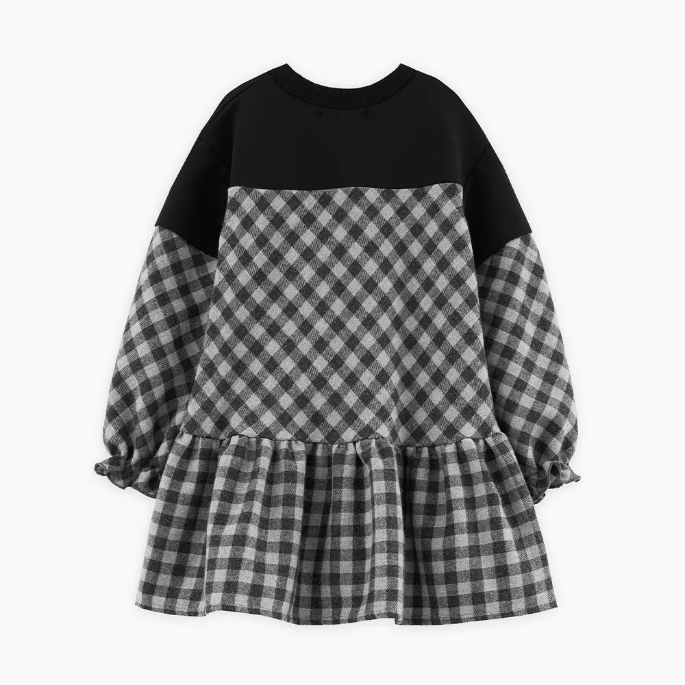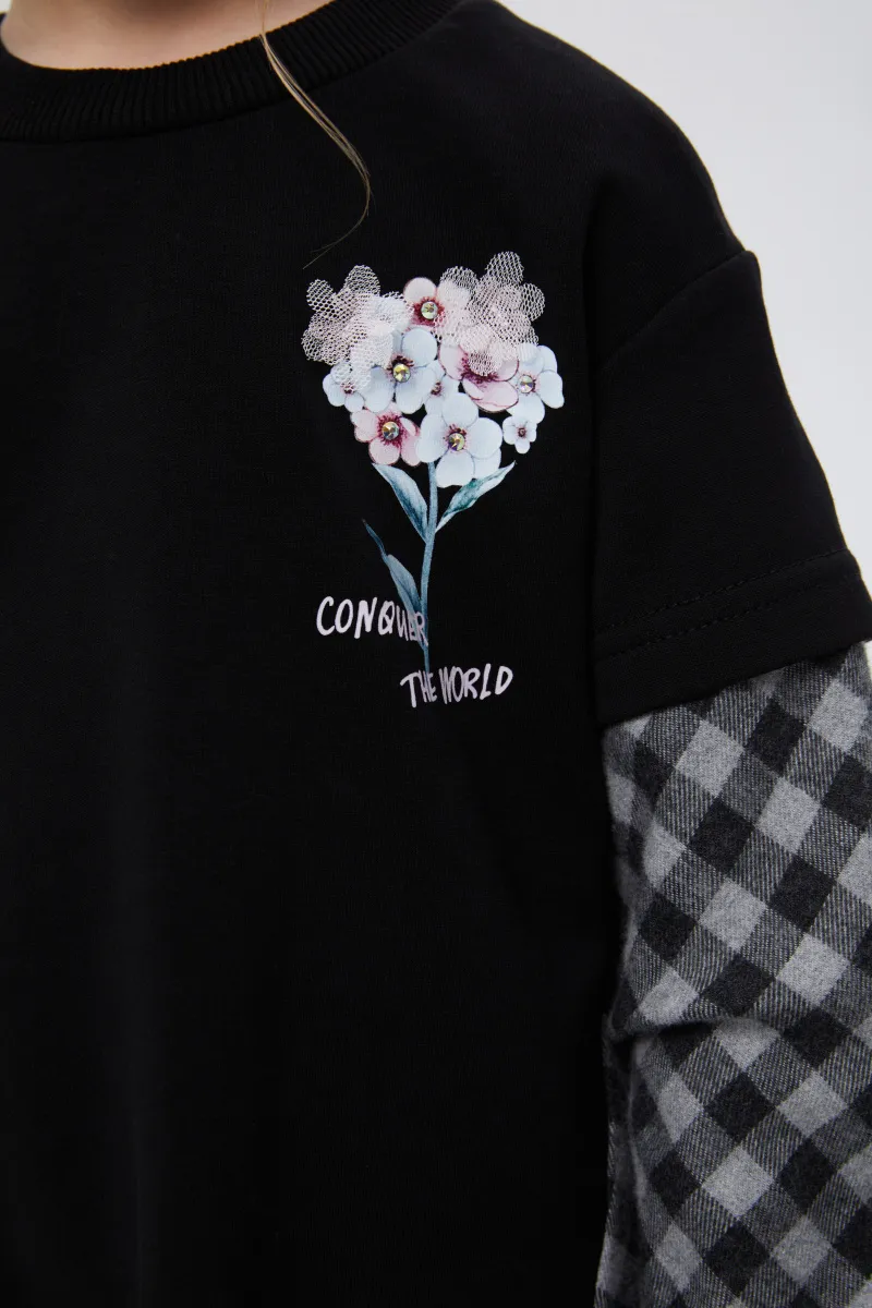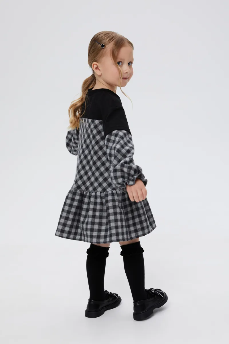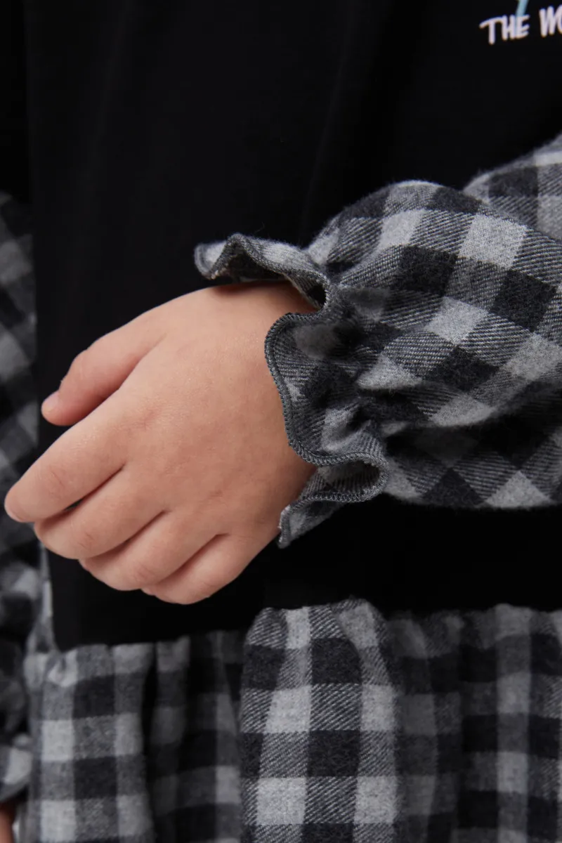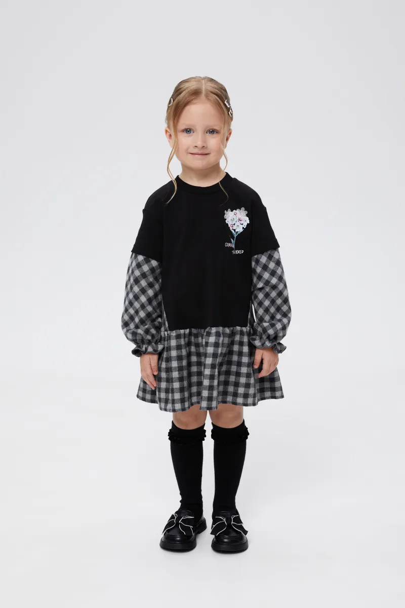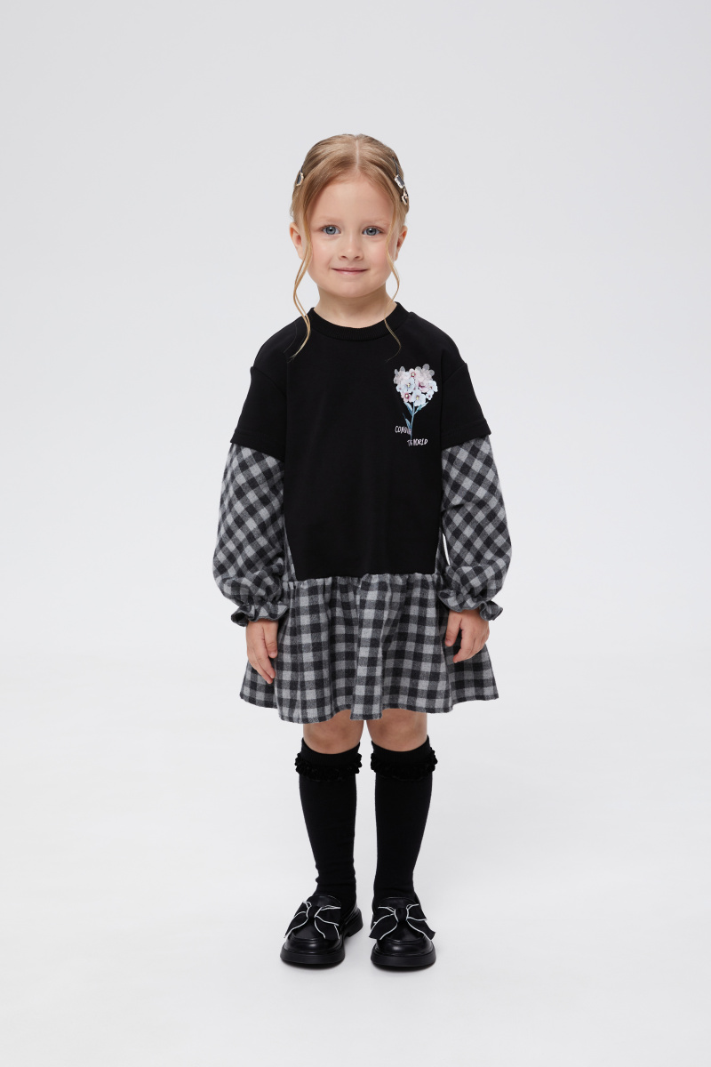 Стильное платье А-образного силуэта для девочки. Спущенная линия плеча. Рукав заканчивается романтичным воланом. Эластичная горловина из рибаны. Комбинация чёрного футера и фланели в клетку делает модель сложно-интересной. Авторская DTF печать и стразы.