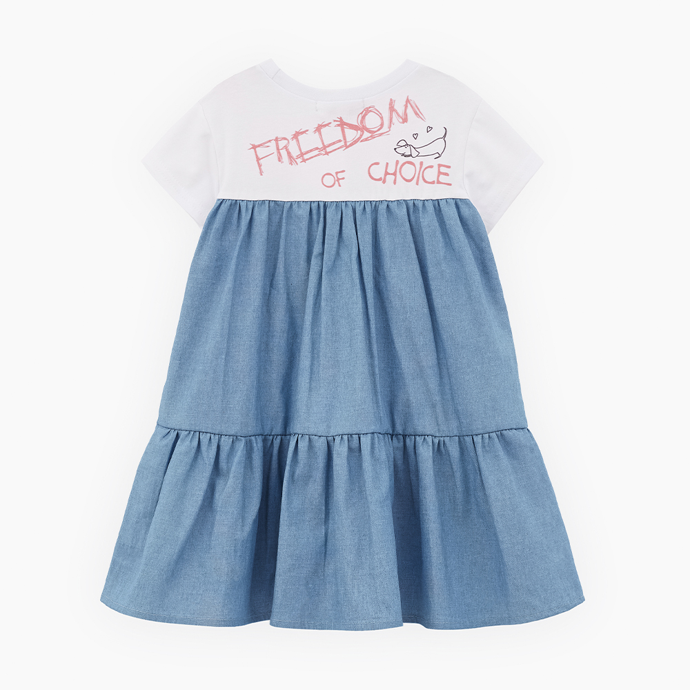 Трендовое платье для девочки. Модель комфортного трапециевидного силуэта. Эластичная горловина. Комбинация материалов: джинс и кулирная гладь. Изделие декорировано авторскими принтами и вышивкой с отлетным элементом.