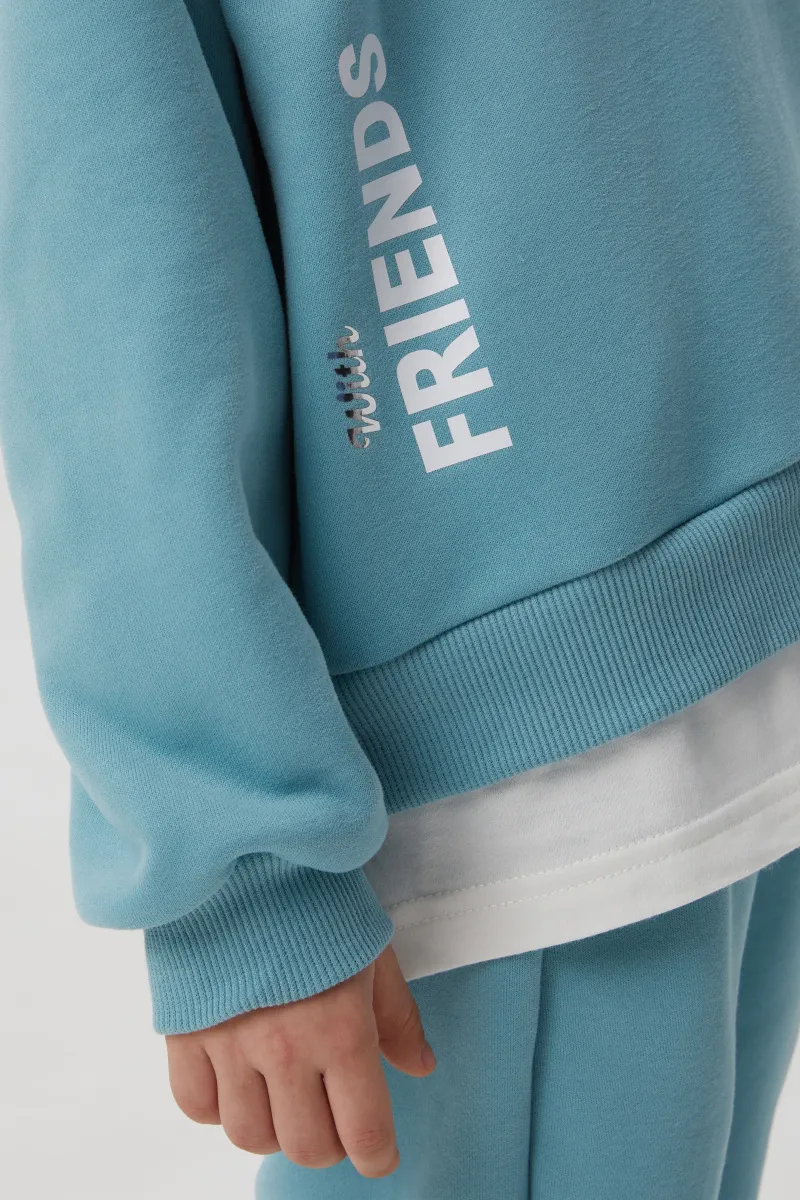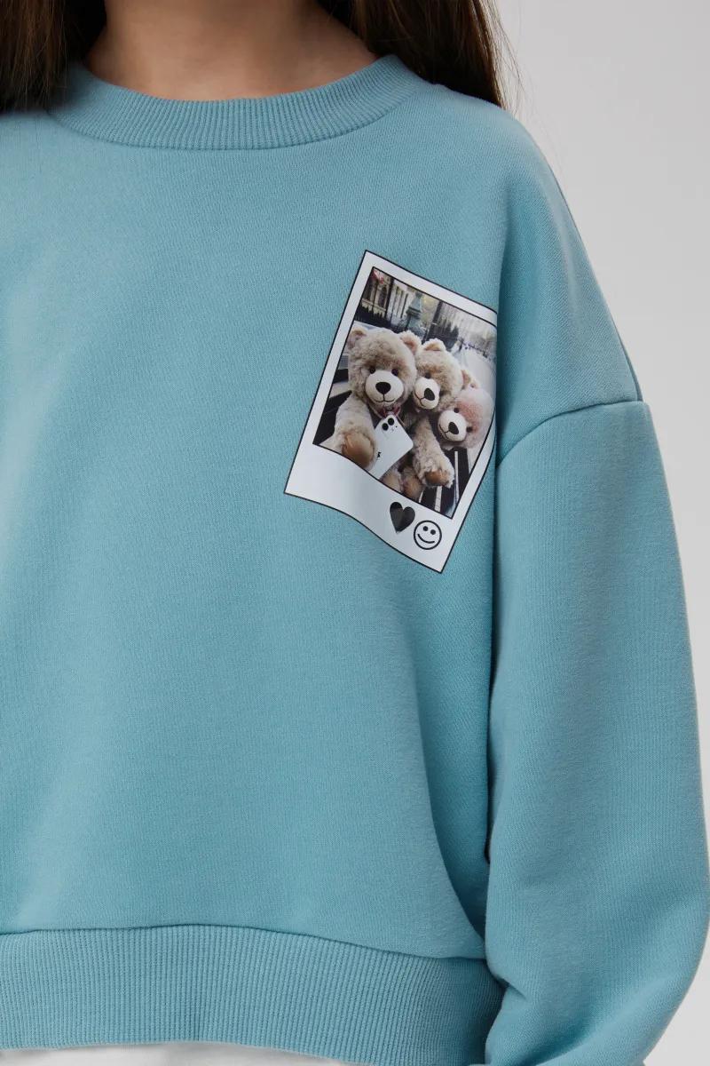 Свитшот с эффектом многослойности (свитшот + лонгслив) для девочки. Модель прямого объёмного силуэта. Спущенная линия плеча. Воротник, манжеты и низ свитшота из эластичной рибаны. Изделие из футера с бархатистым эффектом. Авторская DTF-печать.