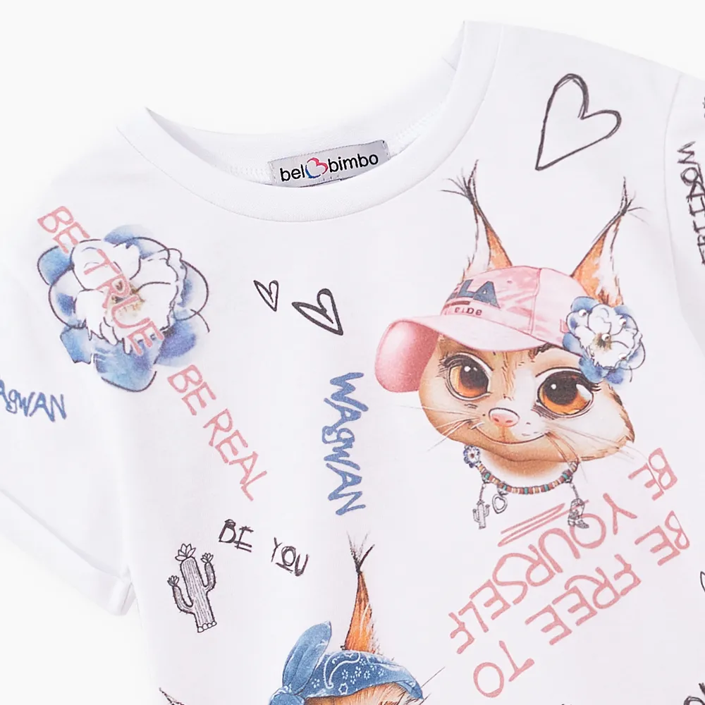 Дизайнерская белая футболка для девочки. Прямая модель. Эластичная горловина. Футболка с авторским принтом декорирована стразами.