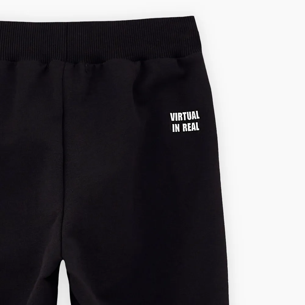 Комфортные чёрные брюки-джоггеры из футера для мальчика. Прямая модель, со средней посадкой. Мягкий эластичный пояс и манжеты. Модель дополнена лаконичным авторским принтом сзади.