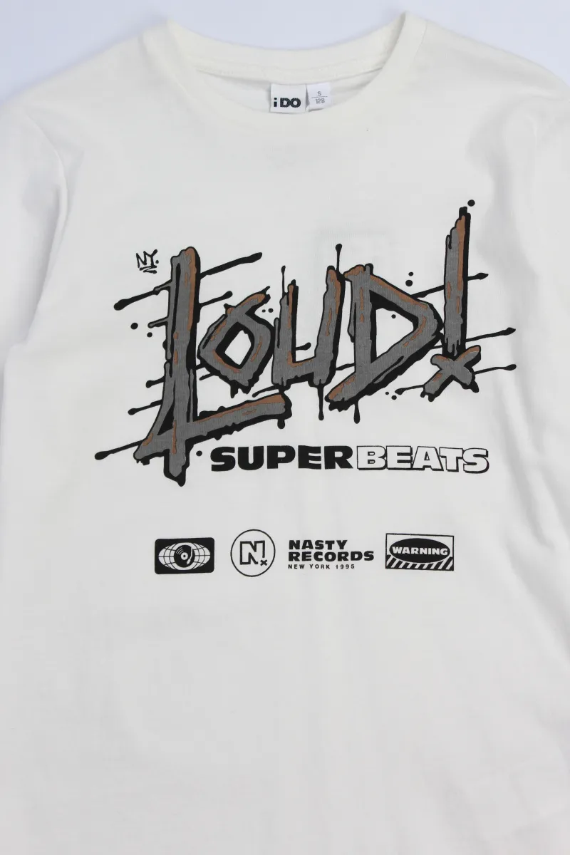 Лонгслив iDO с круглым вырезом для мальчиков из 100% хлопка. На лицевой стороне нанесен принт в виде надписей.