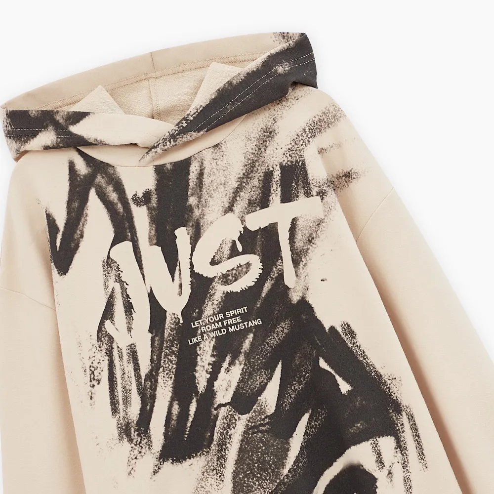 Комфортное худи светло-бежевого оттенка для мальчика. Прямая модель. Глубокий капюшон. Спущенная линия плеча. Эластичные манжеты и низ изделия из рибаны. Худи из тактильно приятного материала. Акцентный принт в стиле граффити.