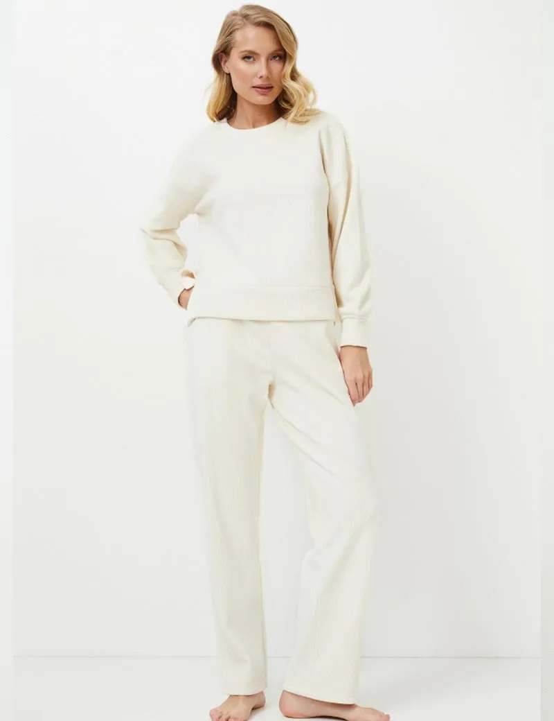 Теплый пижамный комплект NORELLA от литовского бренда Aruelle изготовлен из плюшевого полотна расцветки экрю. Состоит из кофты с длинными рукавами на манжетах и брюк. Подходит для холодных вечеров и дней, даря приятное ощущение тепла.
