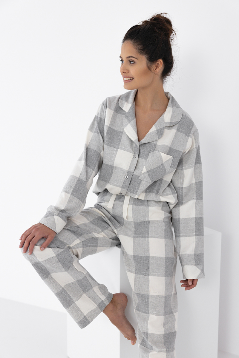 Фланелевая пижама Evie состоит из рубашки и брюк в крупную клетку. Рубашка свободная с фигурным воротником. Брюки прямые, на широкой резинке. Материал плотный. Идеальный вариант не только для сна, но и для домашнего отдыха.
