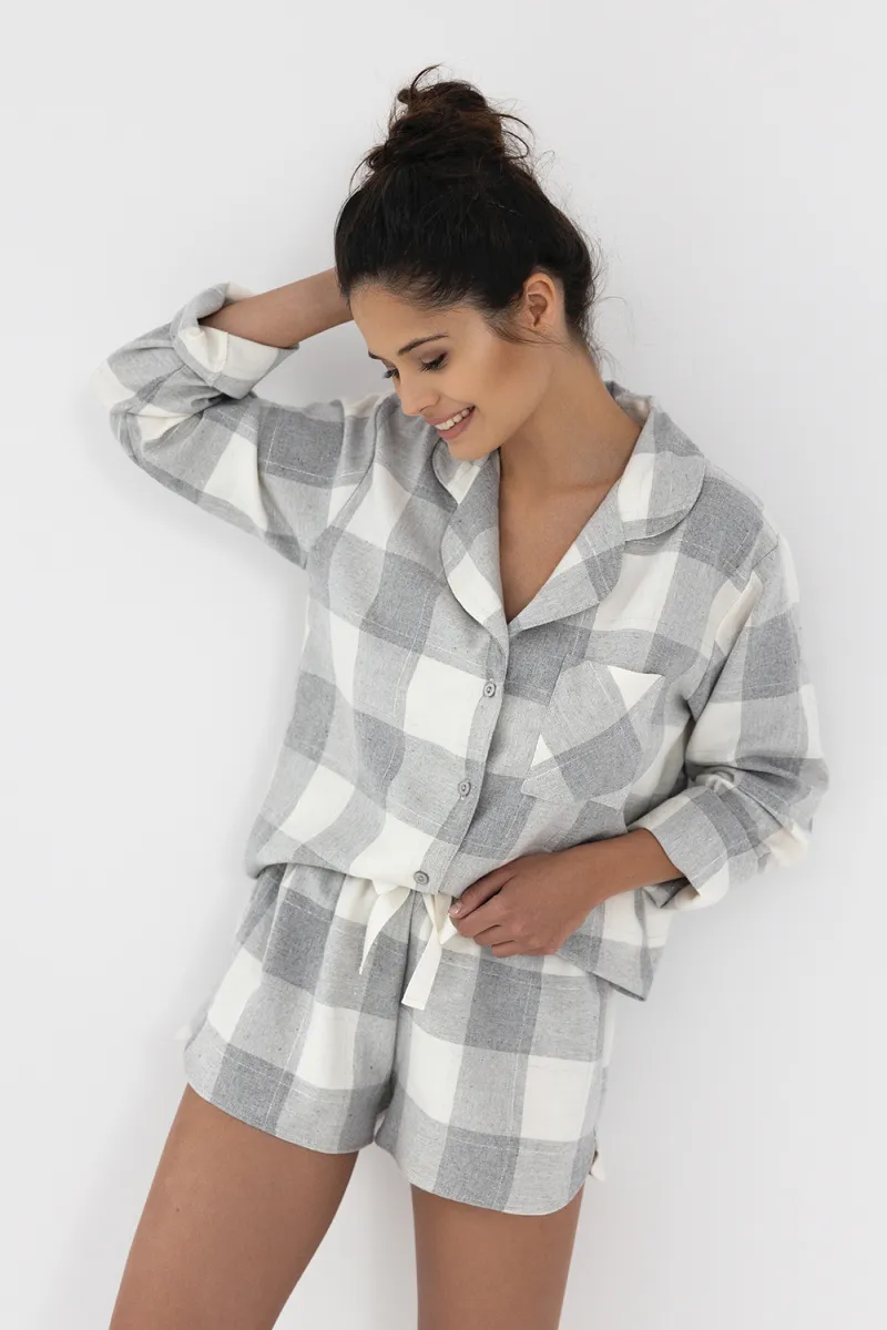 Фланелевая пижама Joanna состоит из рубашки и шорт в крупную клетку. Рубашка свободного кроя. Шорты на широкой резинке, декорированы бантом на поясе. Идеальный вариант не только для сна, но и для домашнего отдыха.