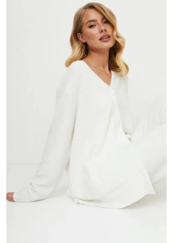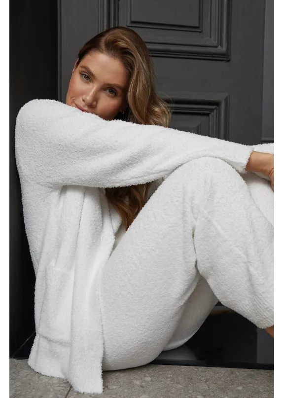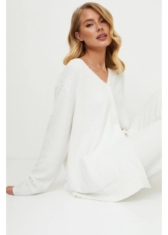 Представляем вашему вниманию уютный комплект Keyla soft, созданный для максимального комфорта. Стильный топ с длинными рукавами застегивается спереди на пуговицы, имеет V-образный вырез и удобные карманы для дополнительной функциональности. В сочетании с брюками этот комплект белого цвета создает успокаивающий образ, напоминающий мягкость овечьей шерсти. Он идеально подходит для стильного отдыха и является воплощением релаксации.
