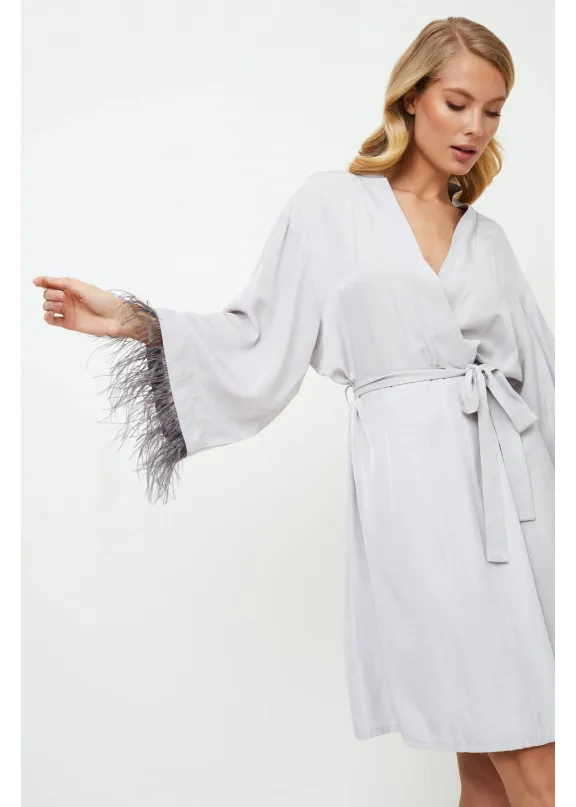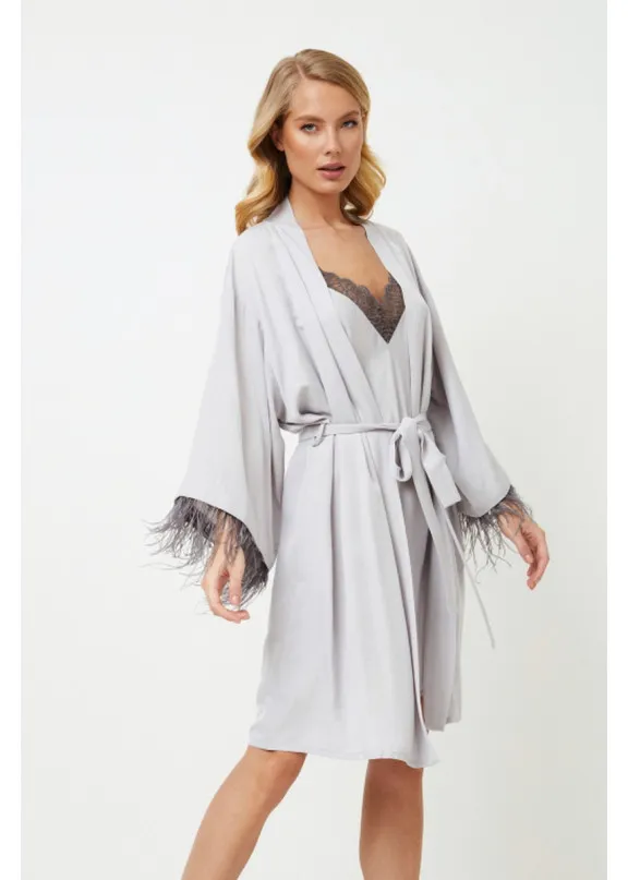 Шикарно и великолепно...не требуется больше слов… Халат Brigitte выполнен из очень мягкой ткани нежно-серого цвета с эффектом шелка. Халат украшен съемными перьями более темного цвета на манжетах и завязывается поясом. Для удобства движений халат дополнительно завязан внутренними завязками. Его легко сочетать с нашей ночной сорочкой Brigitte!