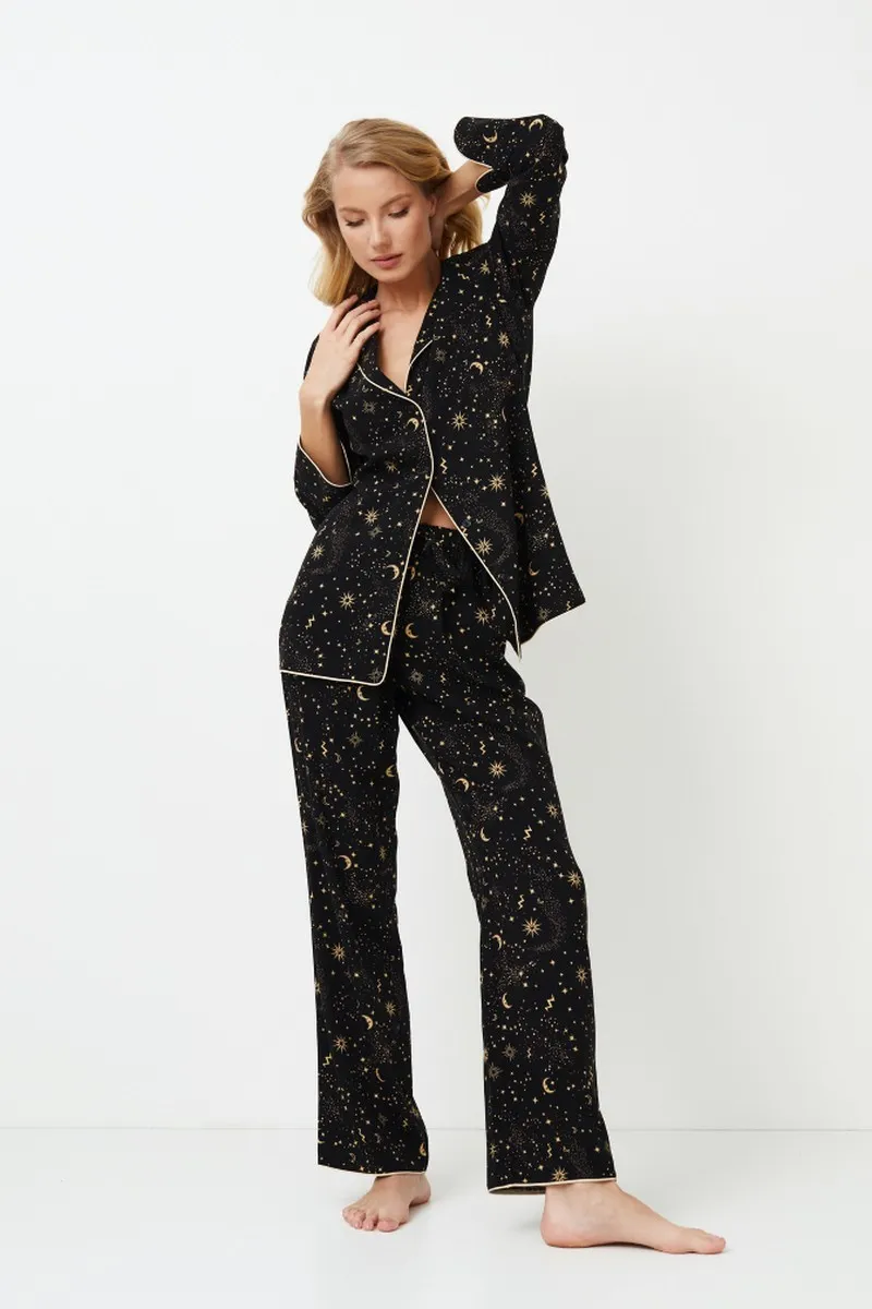 Представляем вашему вниманию длинную пижаму Alexandra, в которой уют сочетается с шиком, создавая ощущение блаженства перед сном. Рубашка с длинными рукавами застегивается на пуговицы и имеет стильный V-образный воротник с контрастной окантовкой по краю воротника спереди, низу и рукавам. Брюки классического кроя с удобными карманами и окантовкой в тон по нижнему краю. Пижама потрясающего черного цвета, украшенная золотыми орнаментами ночного неба, оживляет образ перед сном. Насладитесь ночным очарованием в пижаме Alexandra pajama long, каждая деталь которой излучает небесное очарование. Ткань - вискоза.