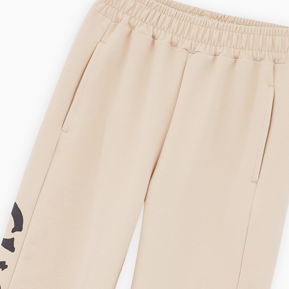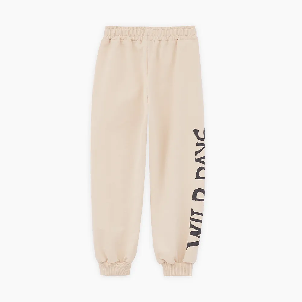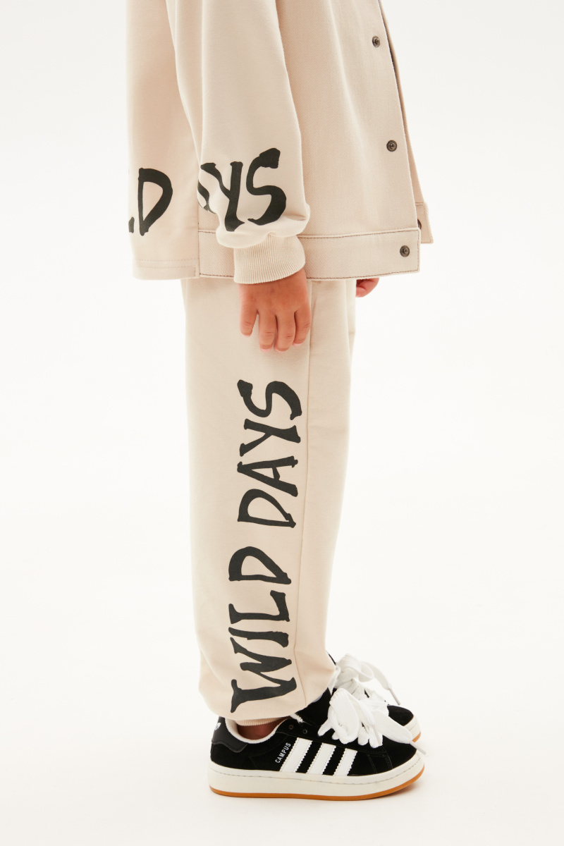Комфортные брюки-джоггеры светло-бежевого оттенка для мальчика. Прямая свободная модель, со средней посадкой. Мягкий эластичный пояс и манжеты. Брюки из тактильно приятного футера. Модель дополнена карманами в шве. Авторский шрифтовой принт.