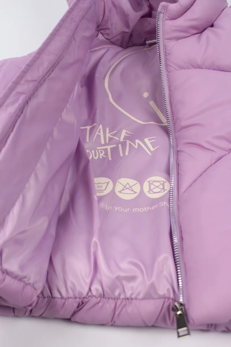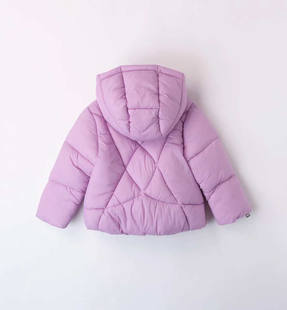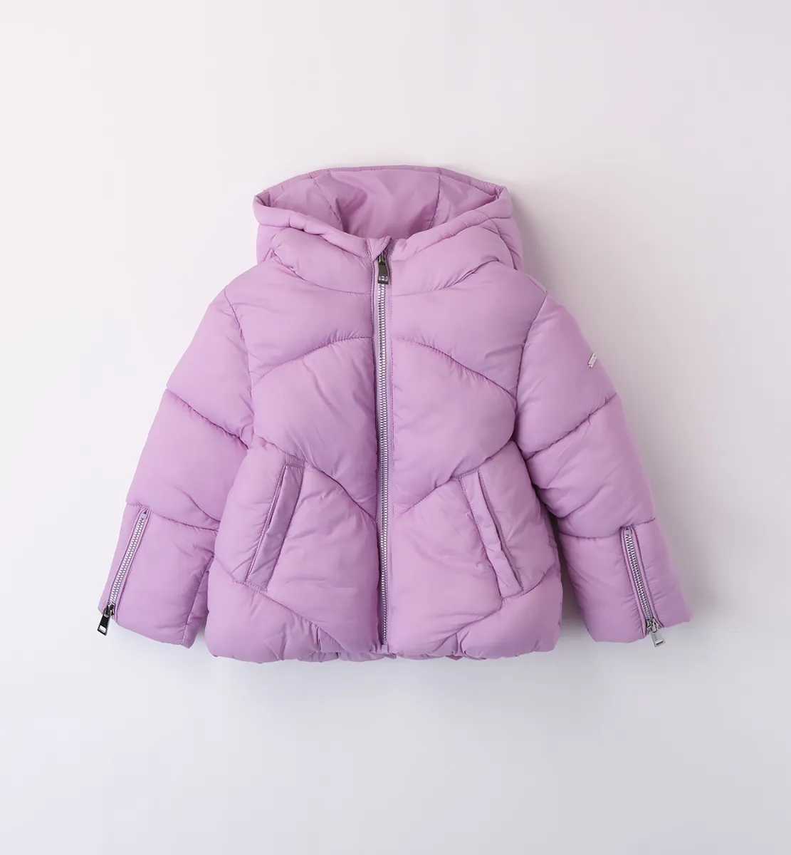 Утепленная куртка iDO для девочки. Модель с несъемным капюшоном и застежкой-молнией с защитой подбородка. Дополнена двумя карманами.
