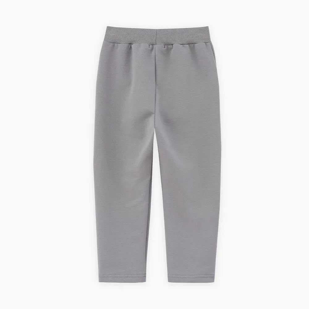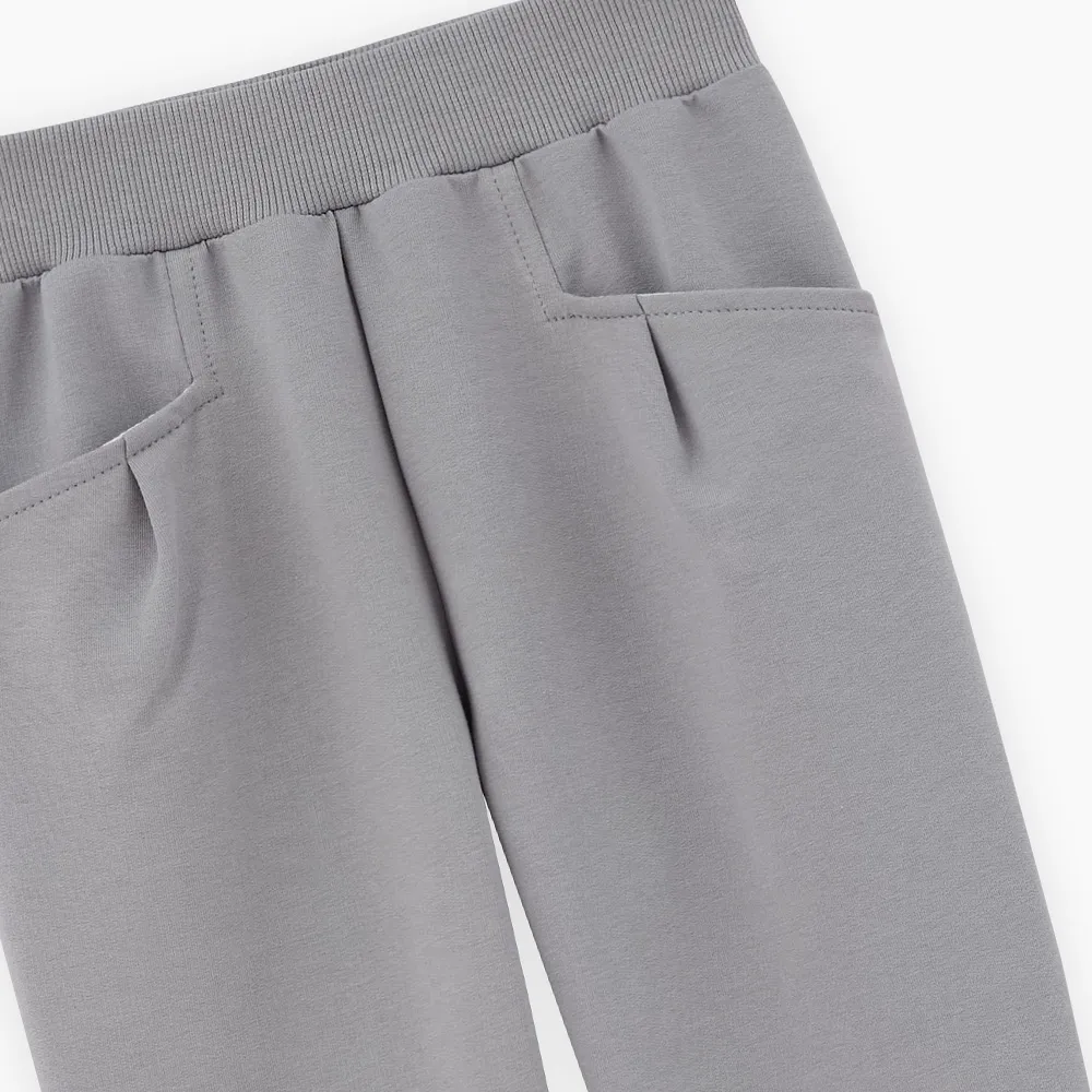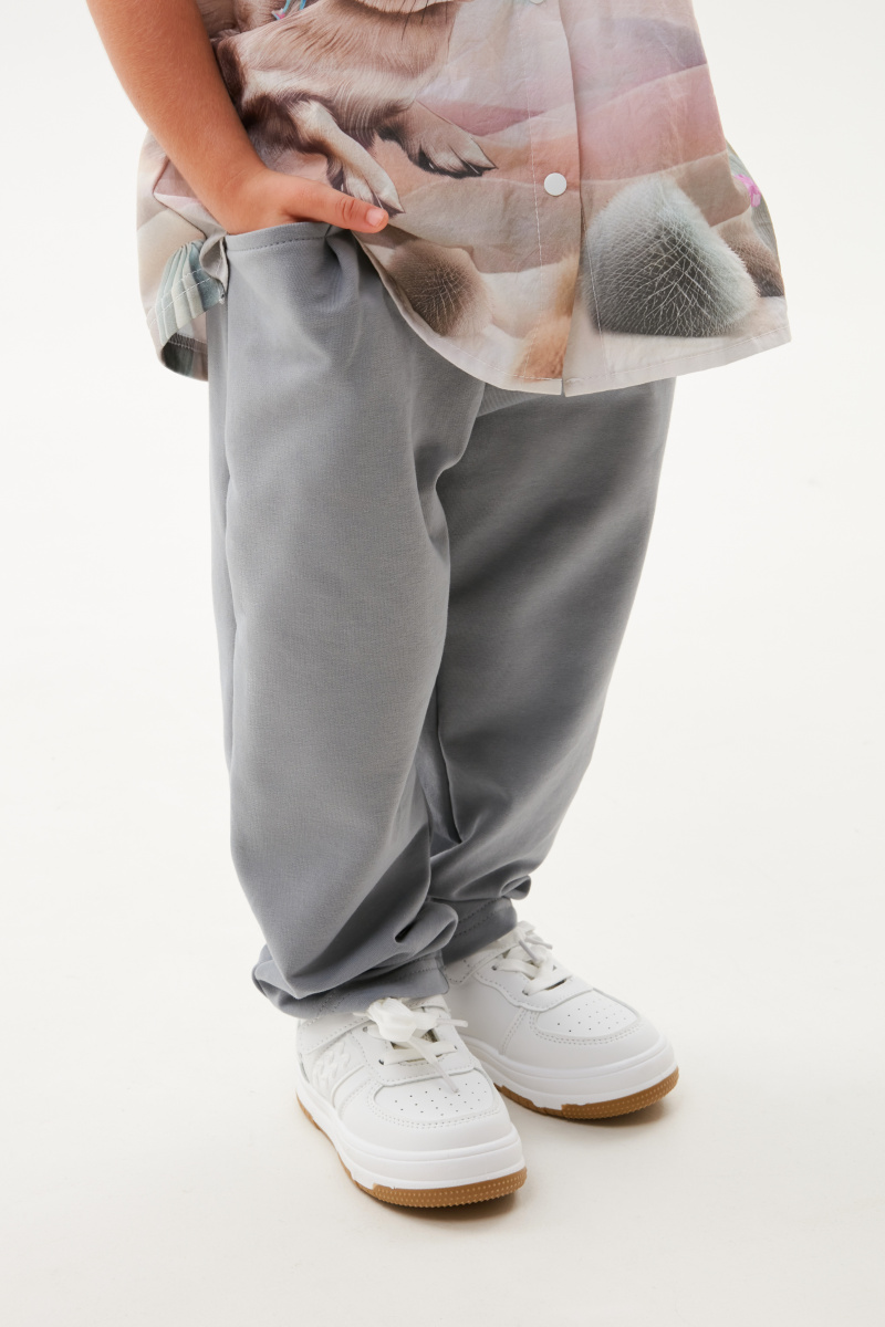 Прямые брюки сложного серо-зелёного оттенка для девочки. Модель расслабленного силуэта, со средней посадкой. Изделие без застёжки, на мягком поясе из эластичной рибаны. Брюки дополнены карманами и декоративными складками.