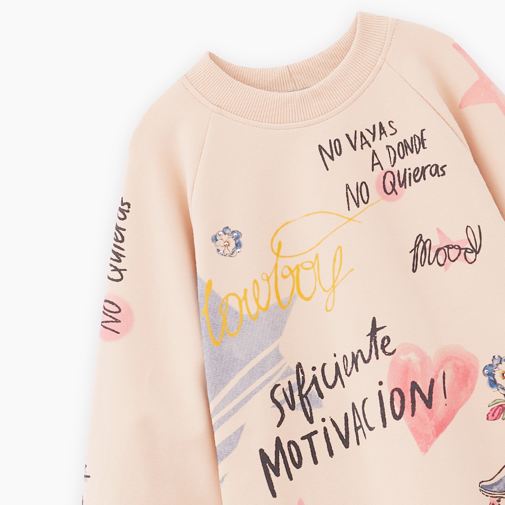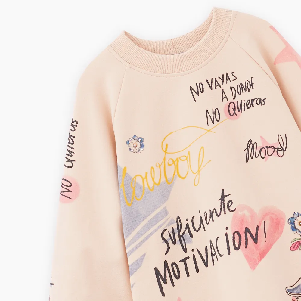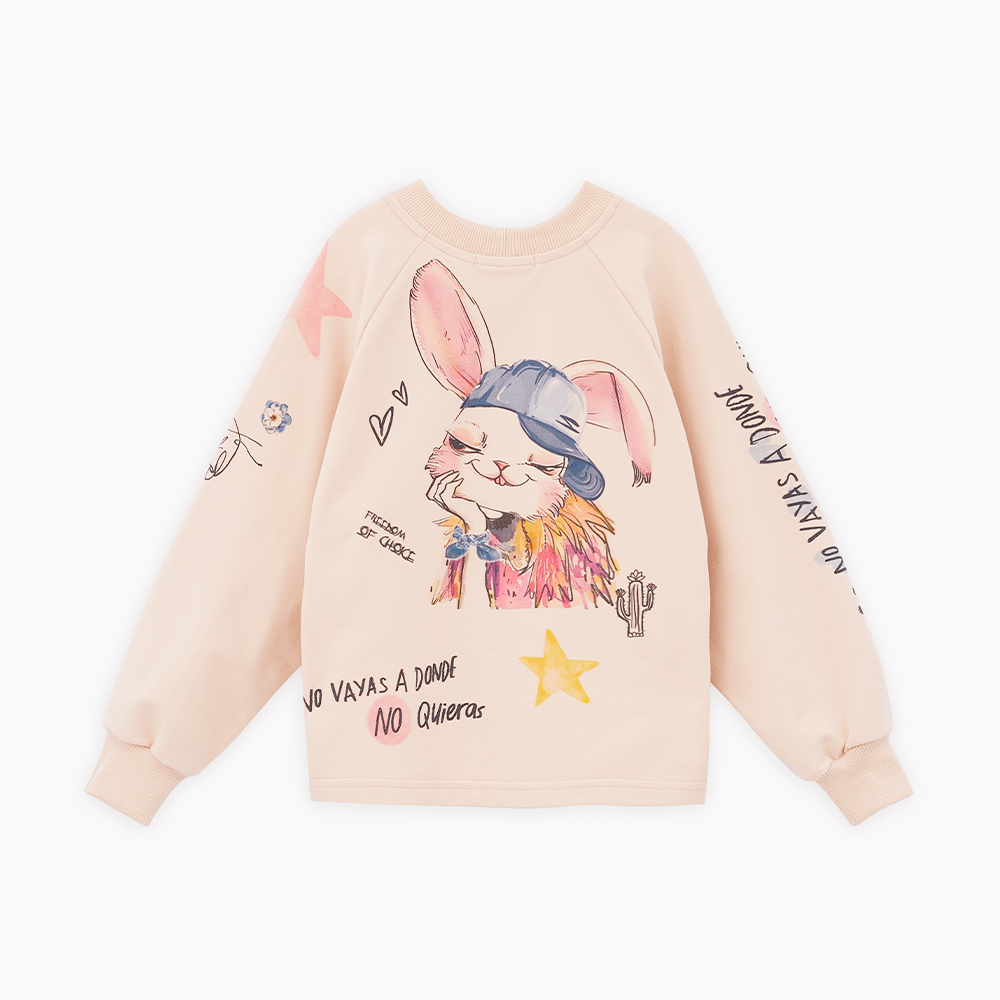 Светло-бежевый свитшот для девочки. Прямая объёмная модель. Манжеты и горловина из эластичной рибаны. Свитшот выполнен из тактильно приятного материала с бархатистым эффектом. Изделие декорировано авторскими принтами и стразами.
