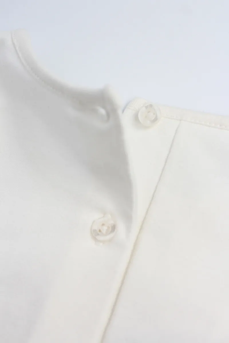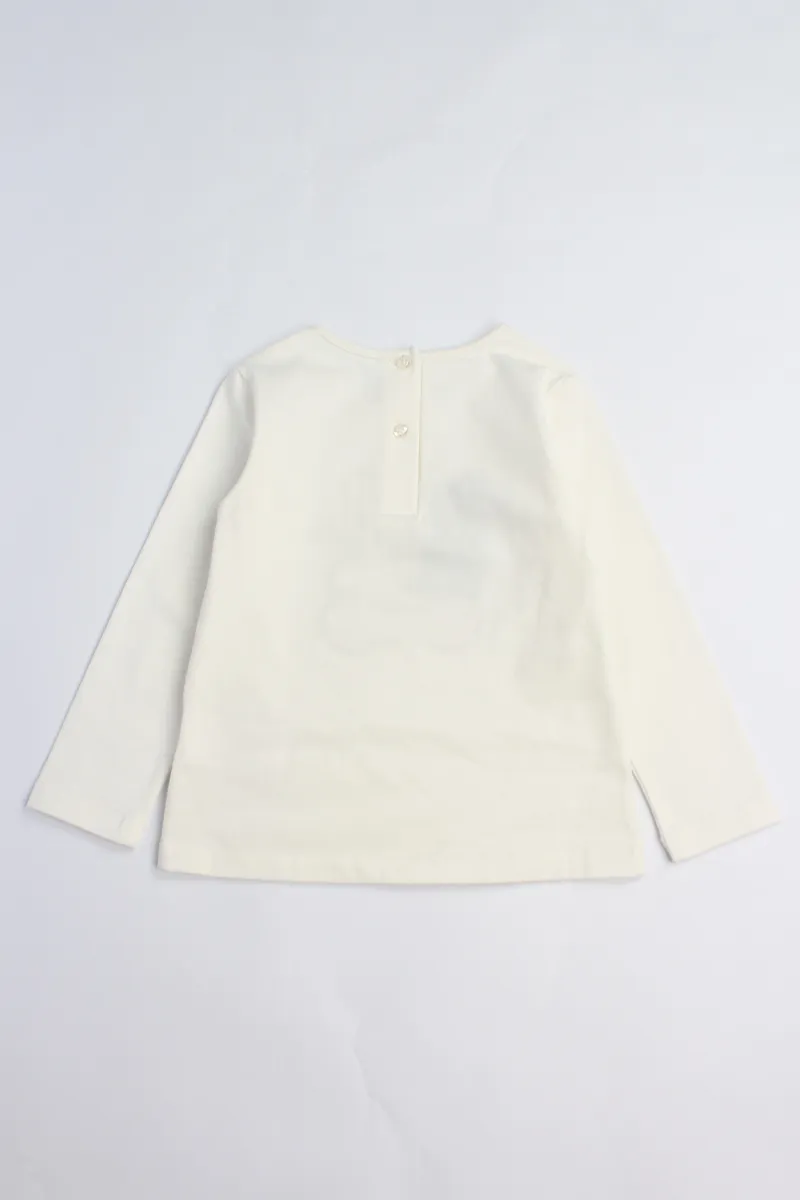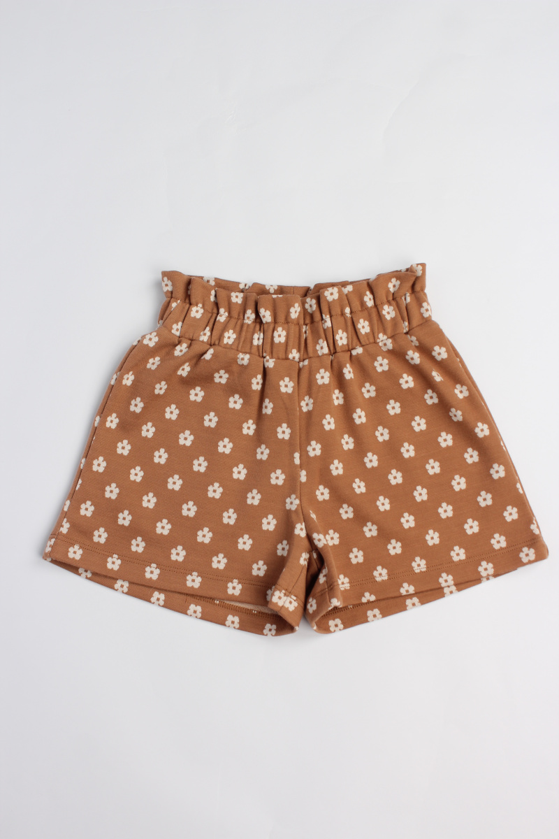 Комплект iDO для девочек состоит из лонгслива, шорт и сумочки. Лонгслив имеет застежку на пуговицы сзади, вышитую аппликацию в виде медведя спереди и выполнен из эластичного хлопкового трикотажа. Шорты выполнены из жаккардовой ткани с цветочным узором. Сумочка на цепочке в тон шортам.