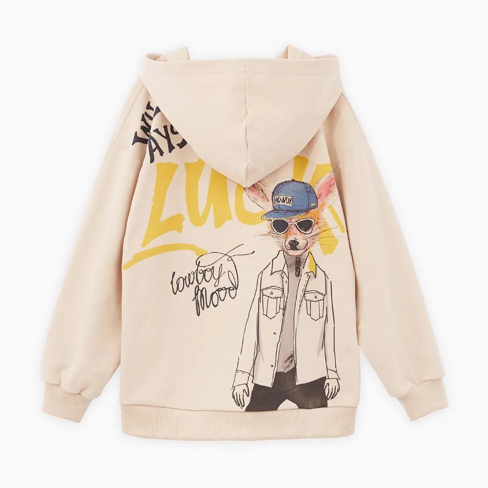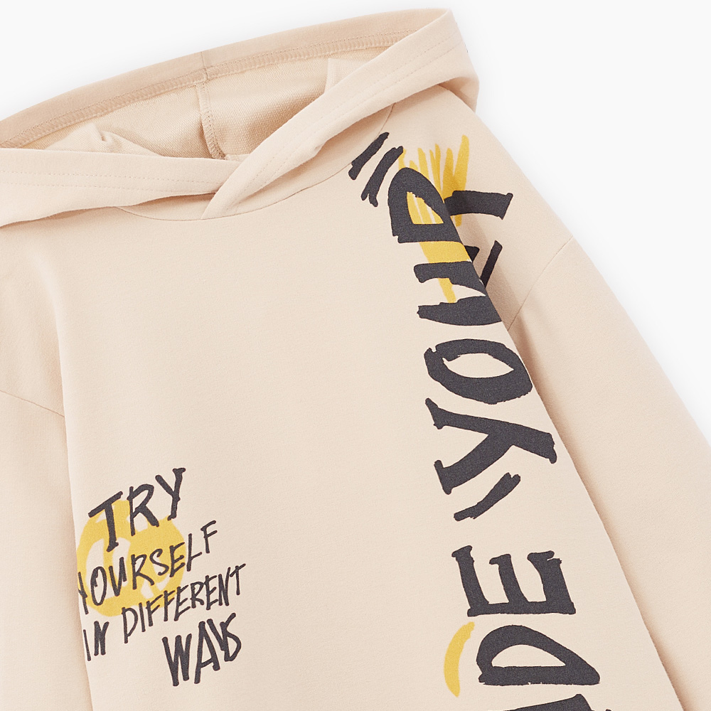 Худи светло-бежевого оттенка для мальчика. Прямая объёмная модель. Глубокий капюшон. Спущенная линия плеча. Эластичные манжеты и низ изделия из рибаны. Худи из тактильно приятного материала. Акцентный герой и шрифтовые принты в стиле граффити.