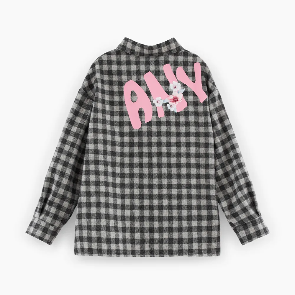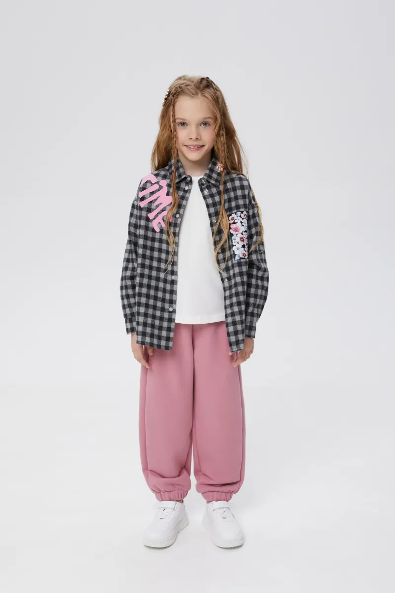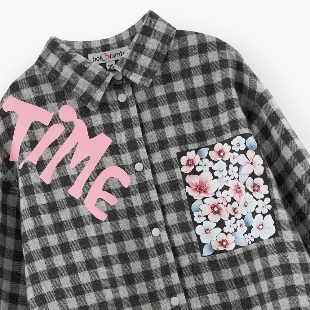 Стильная рубашка в клетку для девочки. Прямая модель. Длинный рукав со спущенной линией плеча. Комфортная застёжка на кнопки. Рубашка декорирована авторскими печатями, в том числе и современной DTF, стразами. Декоративная имитация кармана.