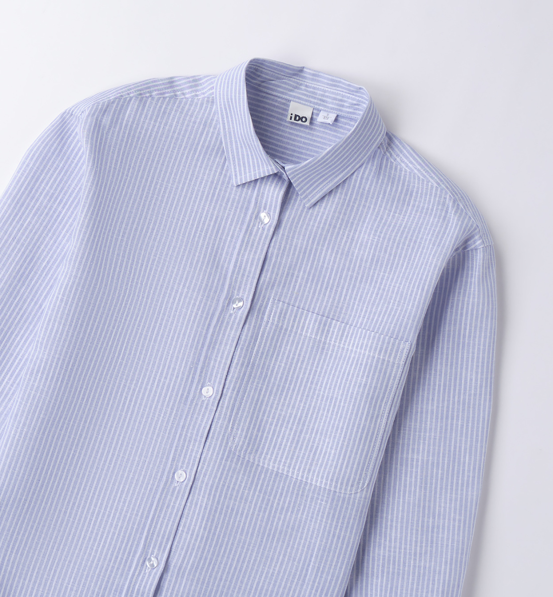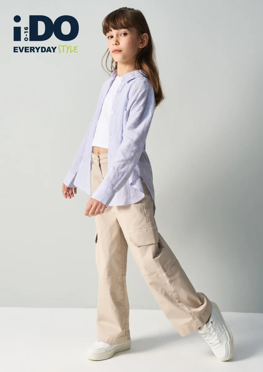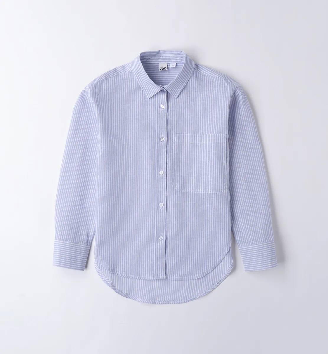 Рубашка в полоску для девочек от итальянского бренда iDO. Модель с воротником стойкой и настрочной планкой спереди, спинка ассиметричная. Отличный вариант для создания casual образов!