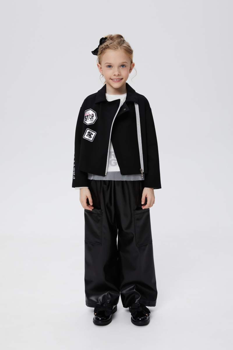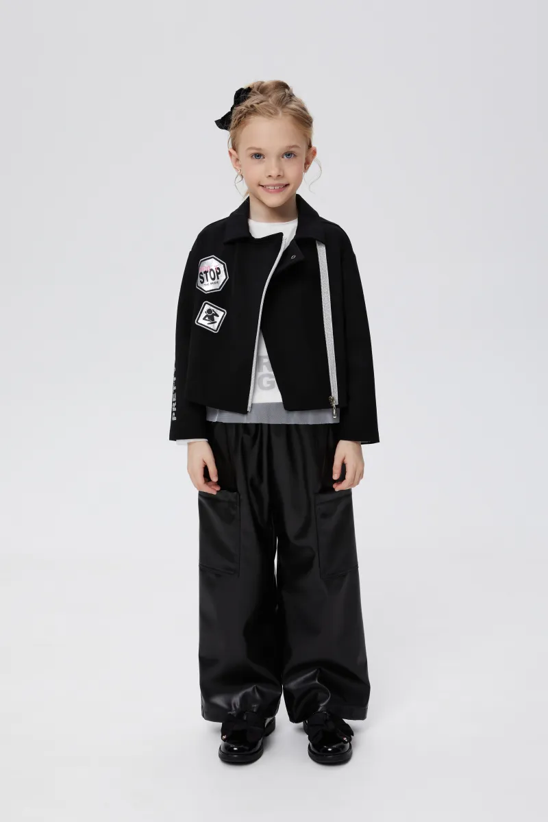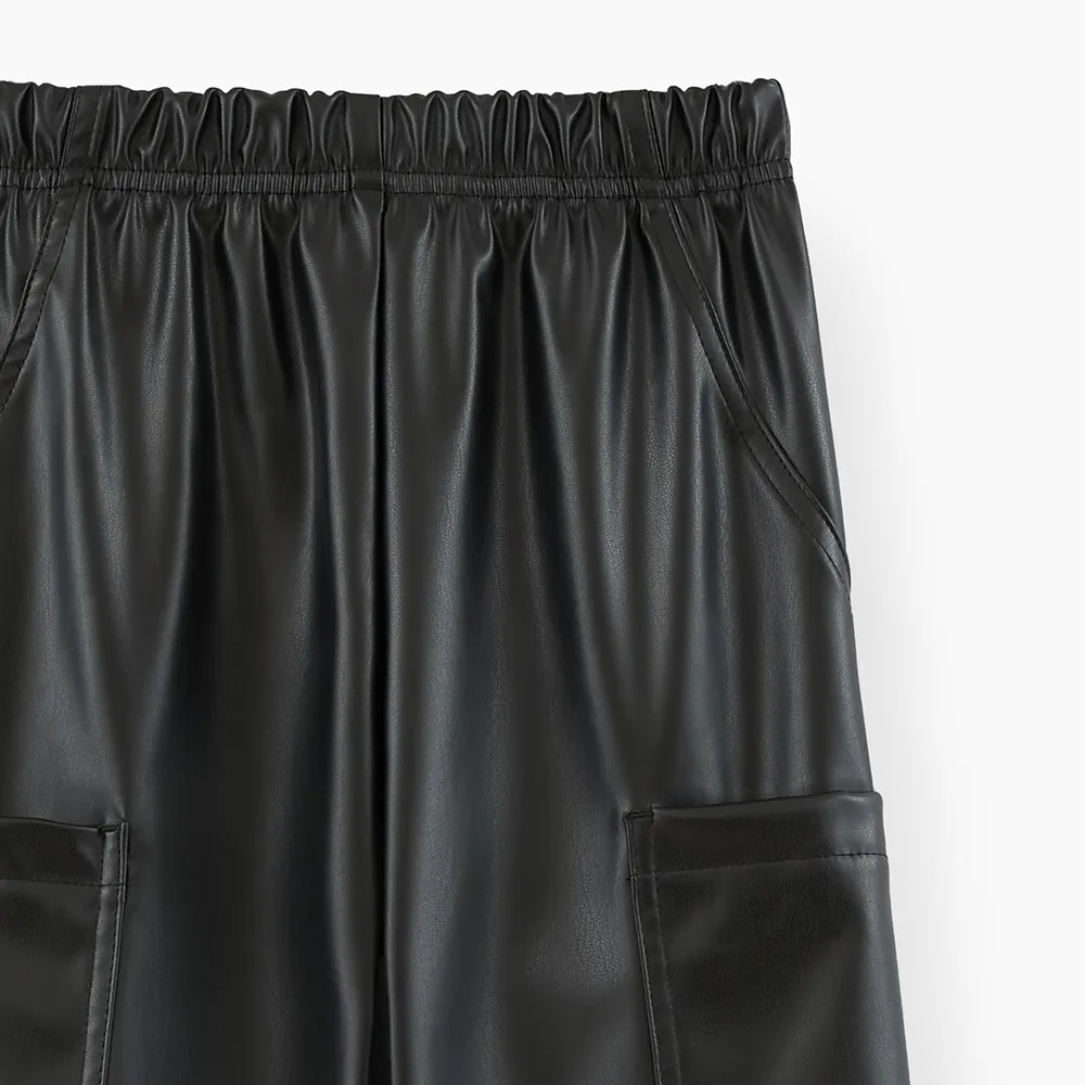 Чёрные брюки-карго из эко-кожи для девочки. Прямая широкая модель со средней посадкой. Изделие без застежки, на мягком эластичном поясе. Брюки дополнены вверху карманами-хулиганами и большими боковыми накладными в области колен.