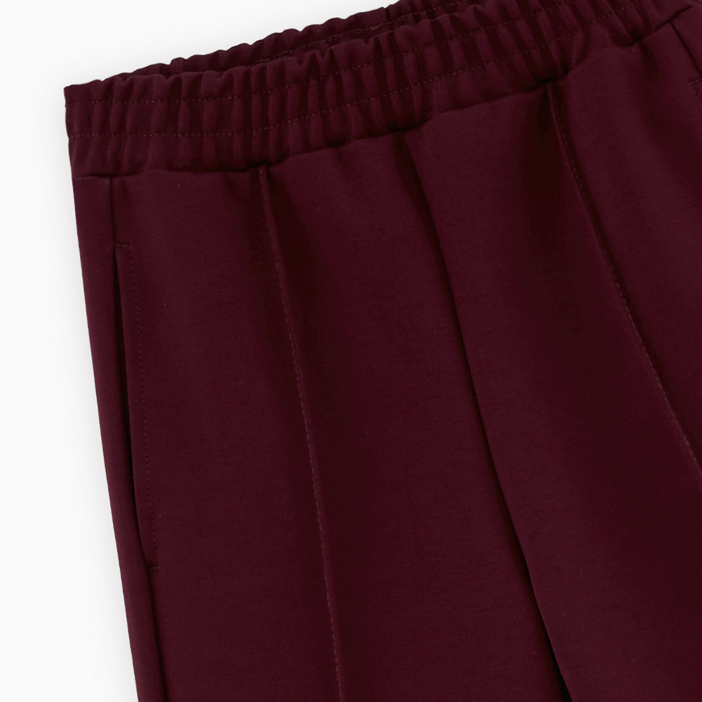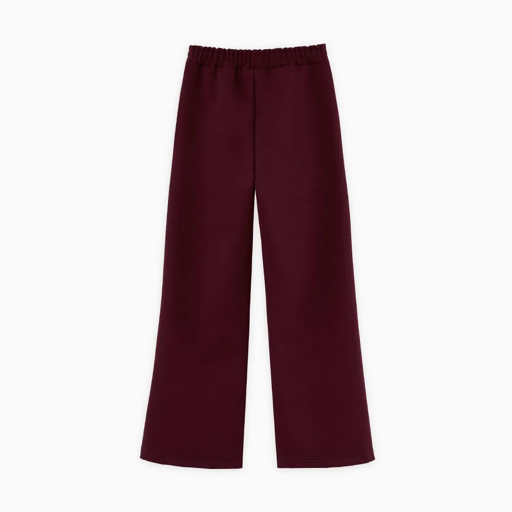 Брюки благородного оттенка гранатовый сок для девочки. Расклешённая от колена модель со средней посадкой. Изделие без застежки, на мягком эластичном поясе. Брюки дополнены акцентными трендовыми стрелками.