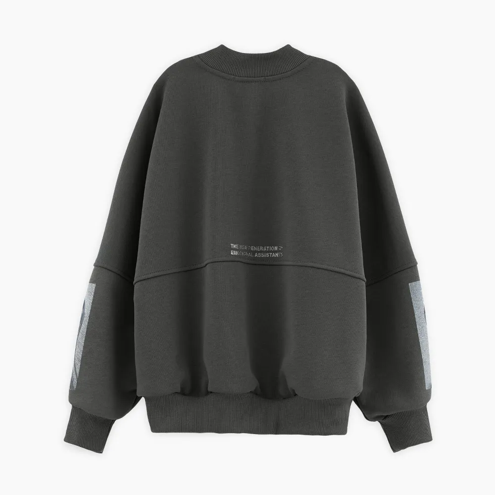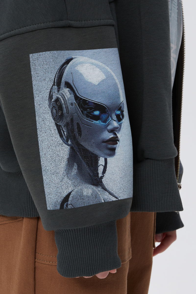 Жакет-бомбер глубокого оттенка тёмный лес для девочки. Объёмная модель О-образного силуэта. Воротник-стойка, манжеты и низ изделия из эластичной рибаны. Комфортная застёжка на молнию. Жакет декорирован авторскими цифровыми и трансферными печатями.