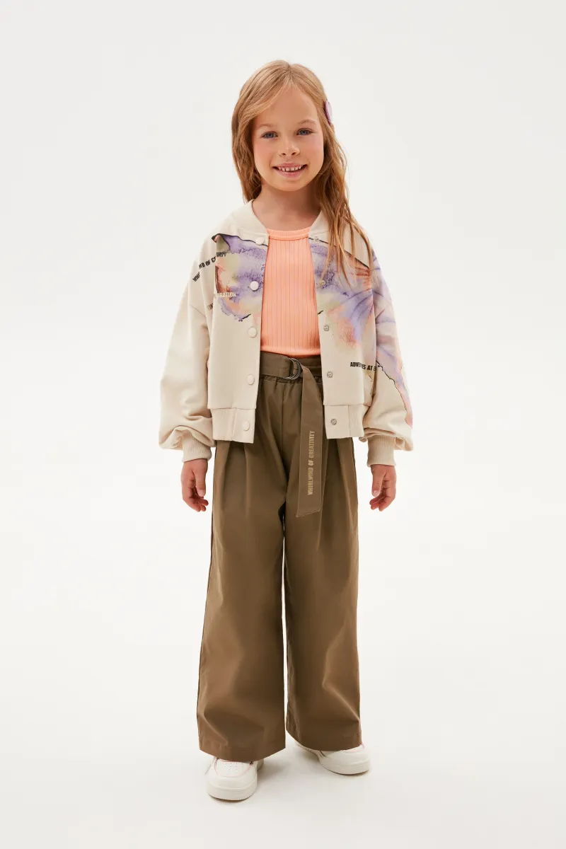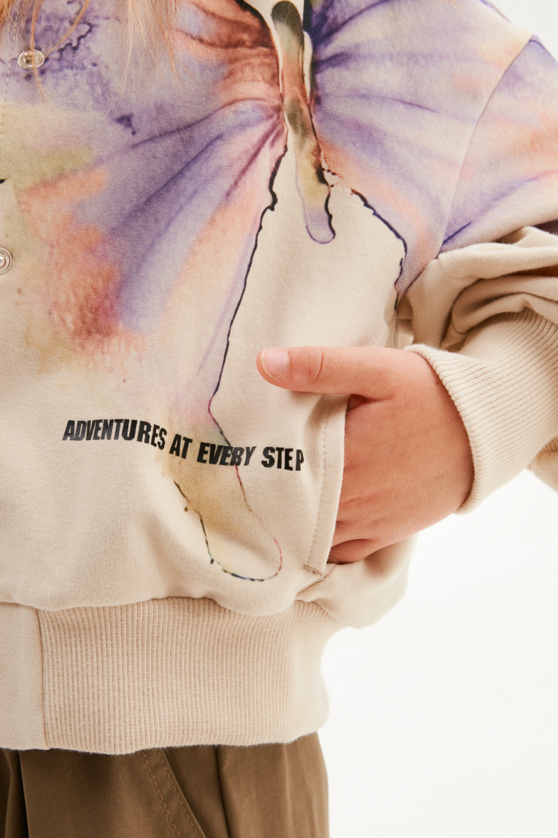 Укороченный жакет-бомбер оттенка экрю. Прямая свободная модель со спущенной линией плеча. Воротник-стойка, манжеты и низ изделия из эластичной рибаны. Застёжка на кнопки. Жакет из футера с бархатистым эффектом декорирован авторскими принтами.