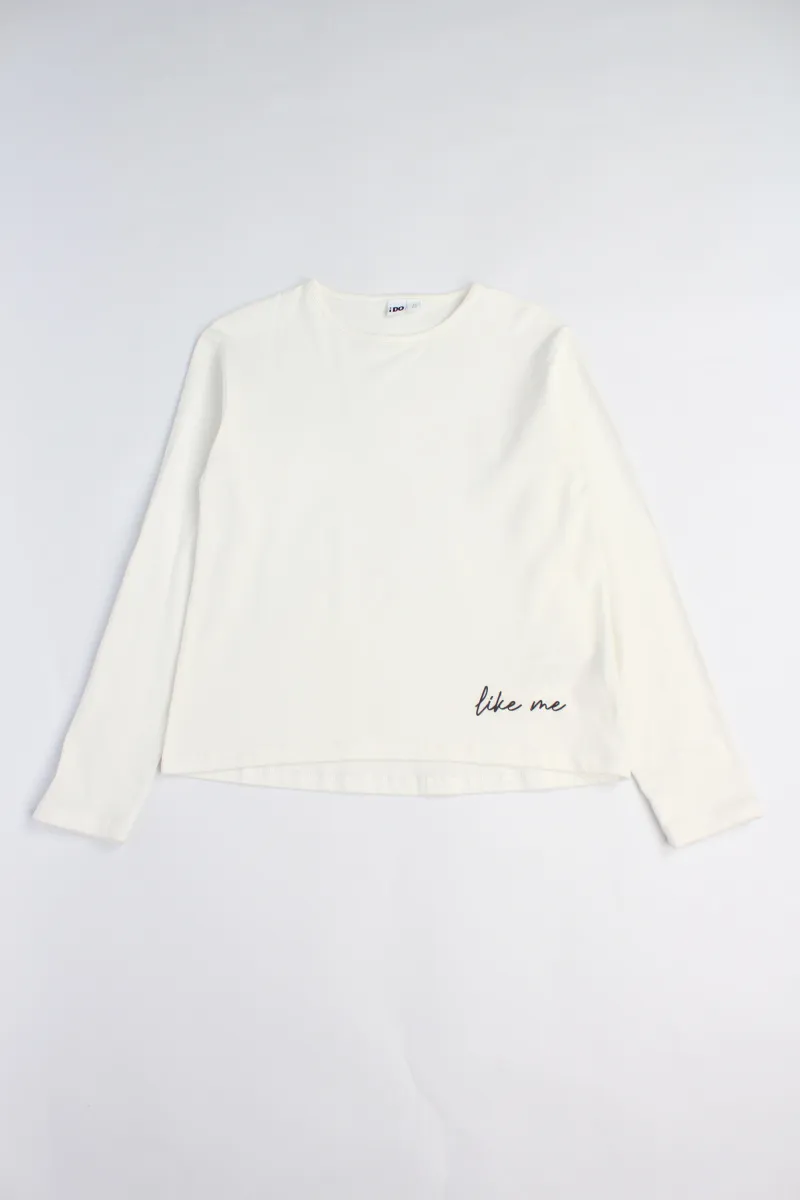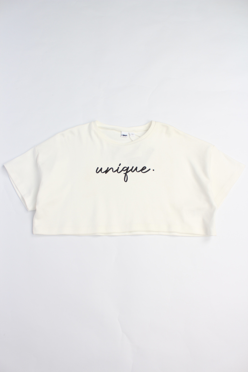 Комплект iDO для девочек, состоит из укороченной футболки из 100% хлопковой ткани интерлок, украшенной принтом, и лонгслива из эластичного хлопкового трикотажа, украшенного принтом-надписью.