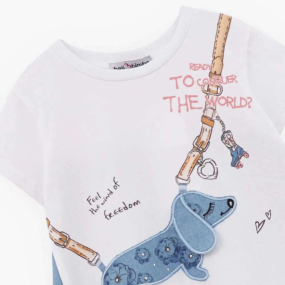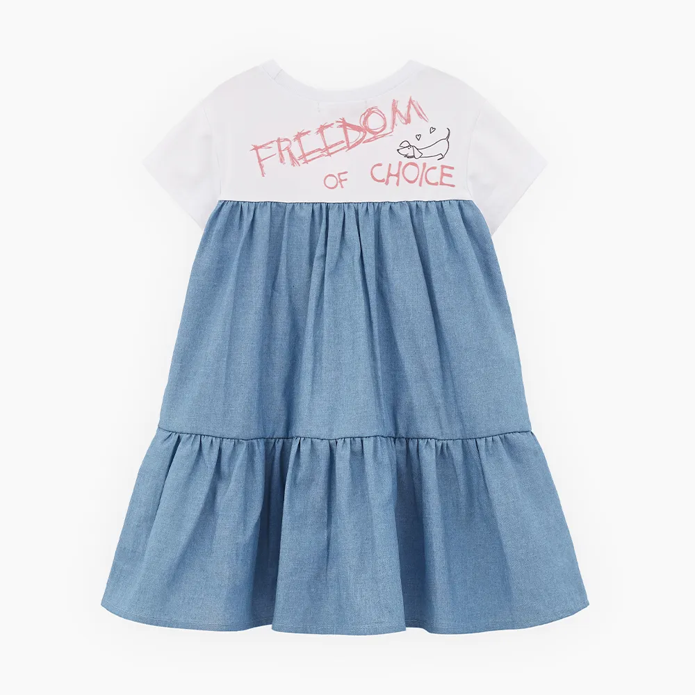 Трендовое платье для девочки. Модель комфортного трапециевидного силуэта. Эластичная горловина. Комбинация материалов: джинс и кулирная гладь. Изделие декорировано авторскими принтами и вышивкой с отлетным элементом.