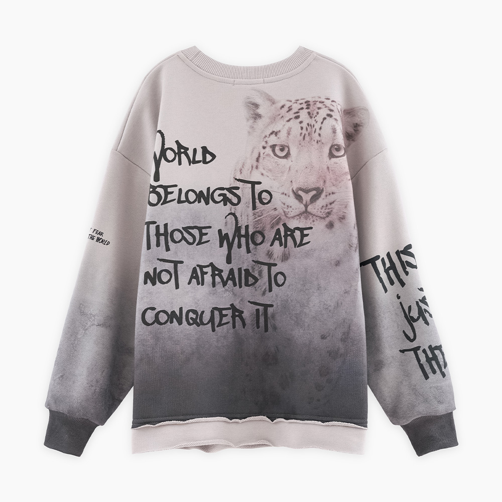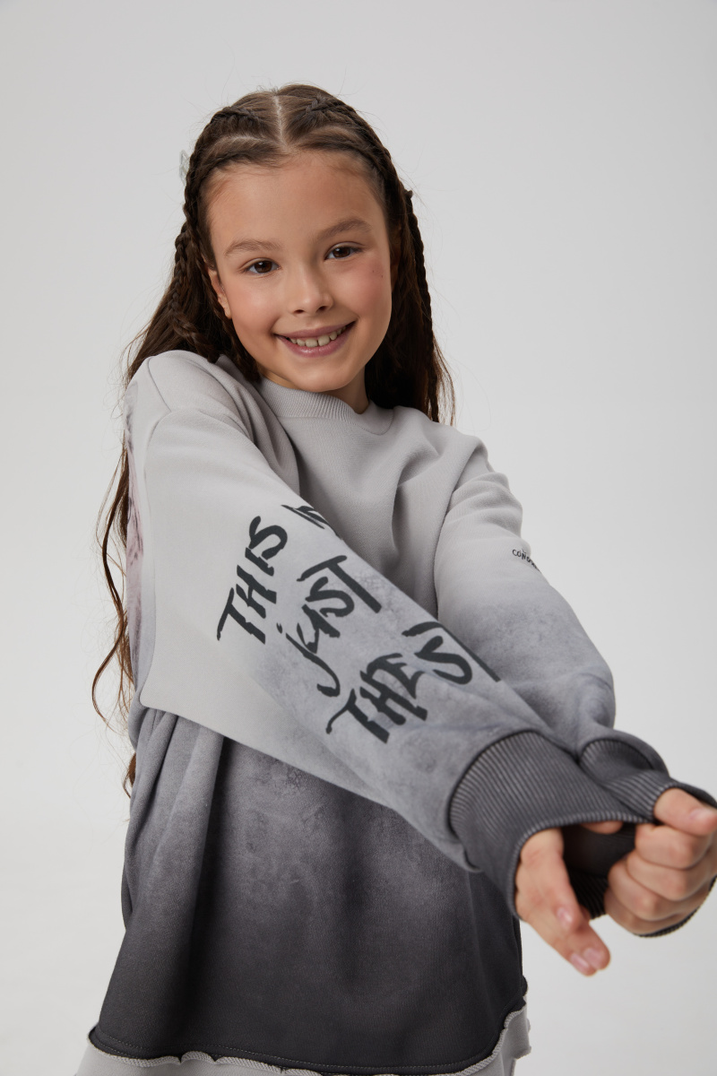 Свитшот оттенка серая дымка из футера с бархатистым эффектом. Модель прямого объёмного силуэта. Спущенная линия плеча. Воротник и манжеты из рибаны. Низ изделия с декоративными прорезями и сырым срезом. Авторские принты, с акцентной спинкой.