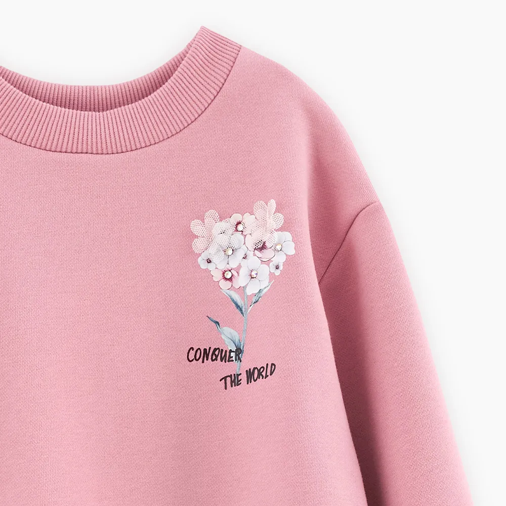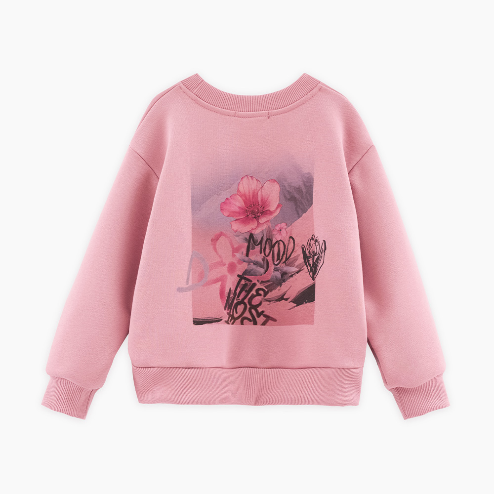 Свитшот приятного розового оттенка для девочки. Модель прямого силуэта. Спущенная линия плеча. Воротник, манжеты и низ изделия из эластичной рибаны. Изделие из футера с бархатистым эффектом. Свитшот декорирован авторской DTF-печатью. Акцентная спинка.