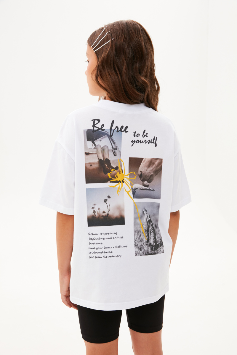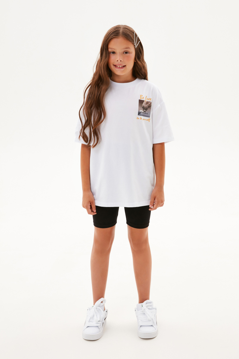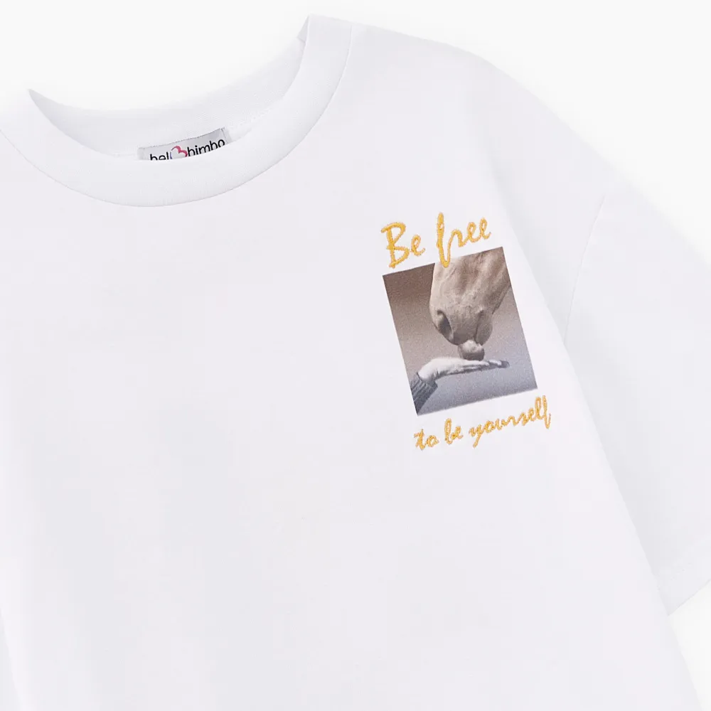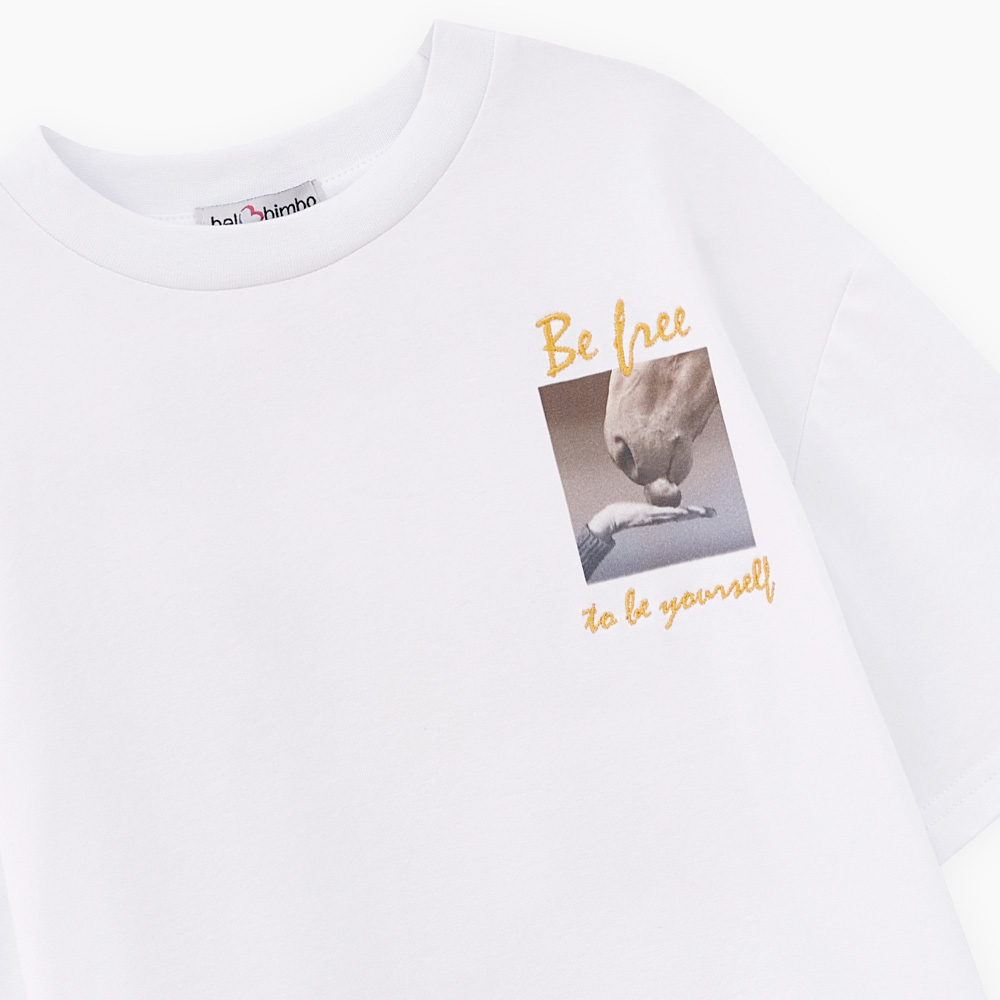 Дизайнерская белая футболка для девочки. Прямая объёмная модель. Спущенная линия плеча. Эластичная горловина. Футболка с авторским принтом декорирована вышивкой.