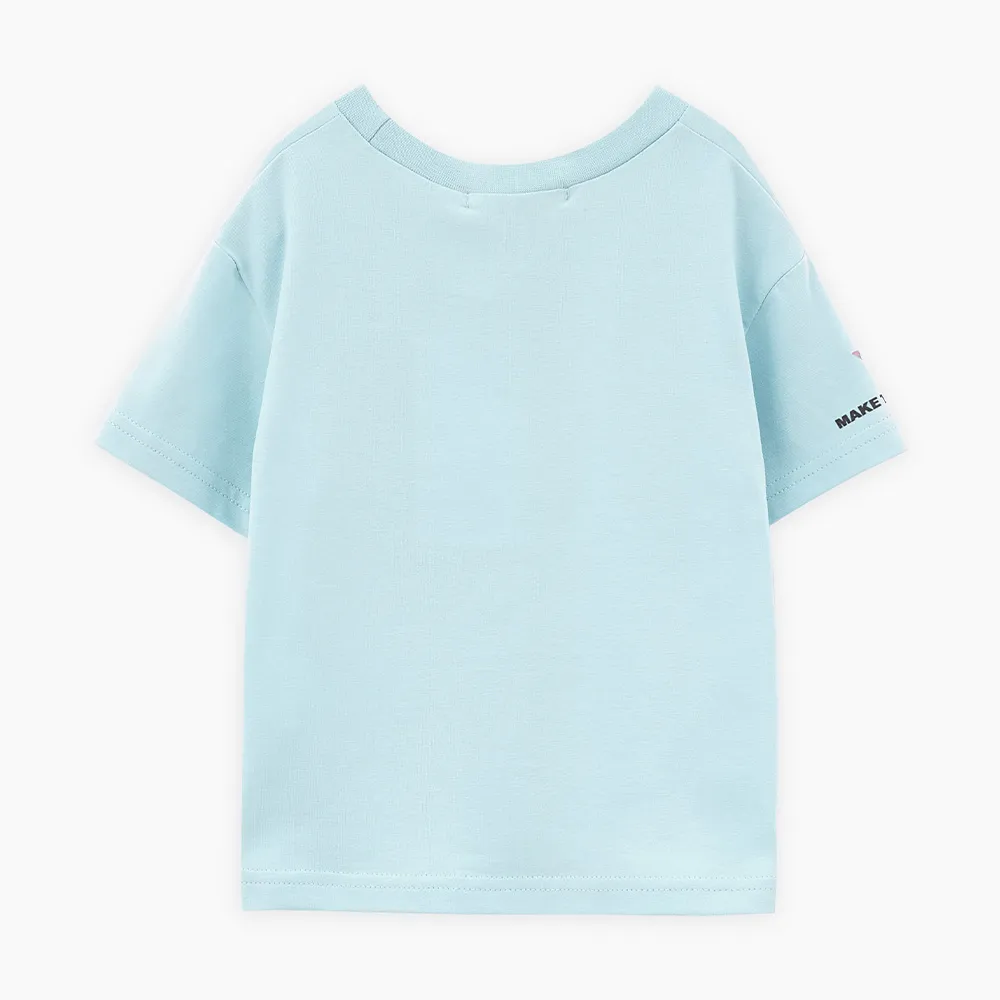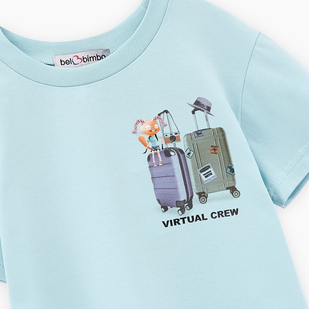 Дизайнерская футболка светло-бирюзового оттенка для девочки. Прямая объёмная модель. Спущенная линия плеча. Эластичная горловина. Футболка с авторскими принтами, инновационная DTF-печать, устойчивая к многократным стиркам.