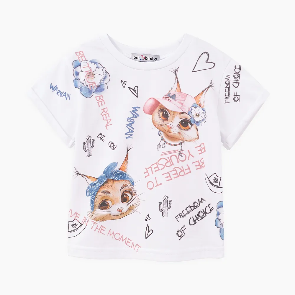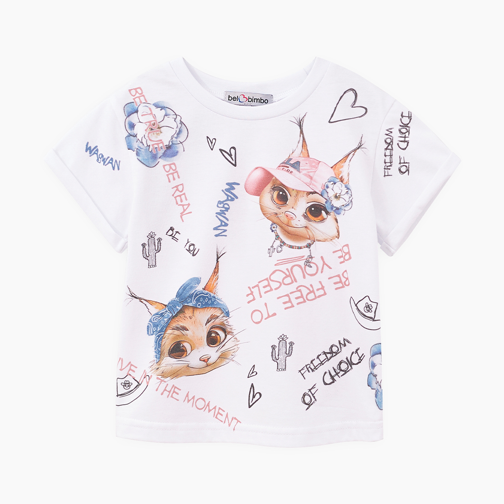 Дизайнерская белая футболка для девочки. Прямая модель. Эластичная горловина. Футболка с авторским принтом декорирована стразами.