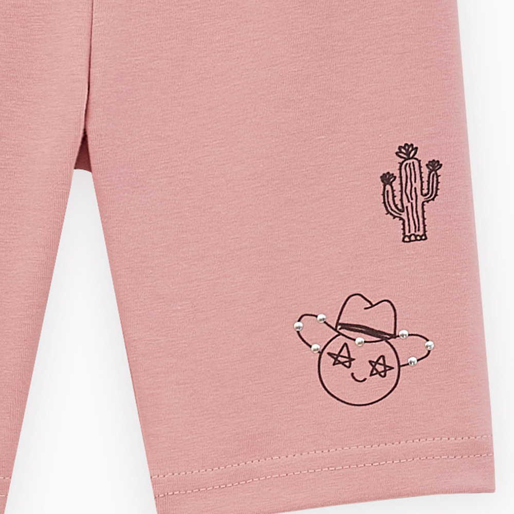 Шорты для девочки. Модель прилегающего силуэта. Изделие на мягком эластичном поясе, со средней посадкой. Шорты из материала с эффектом "жатости", что придаёт оригинальный внешний вид и не требует глажки. Модель декорирована авторскими принтами и стразами.