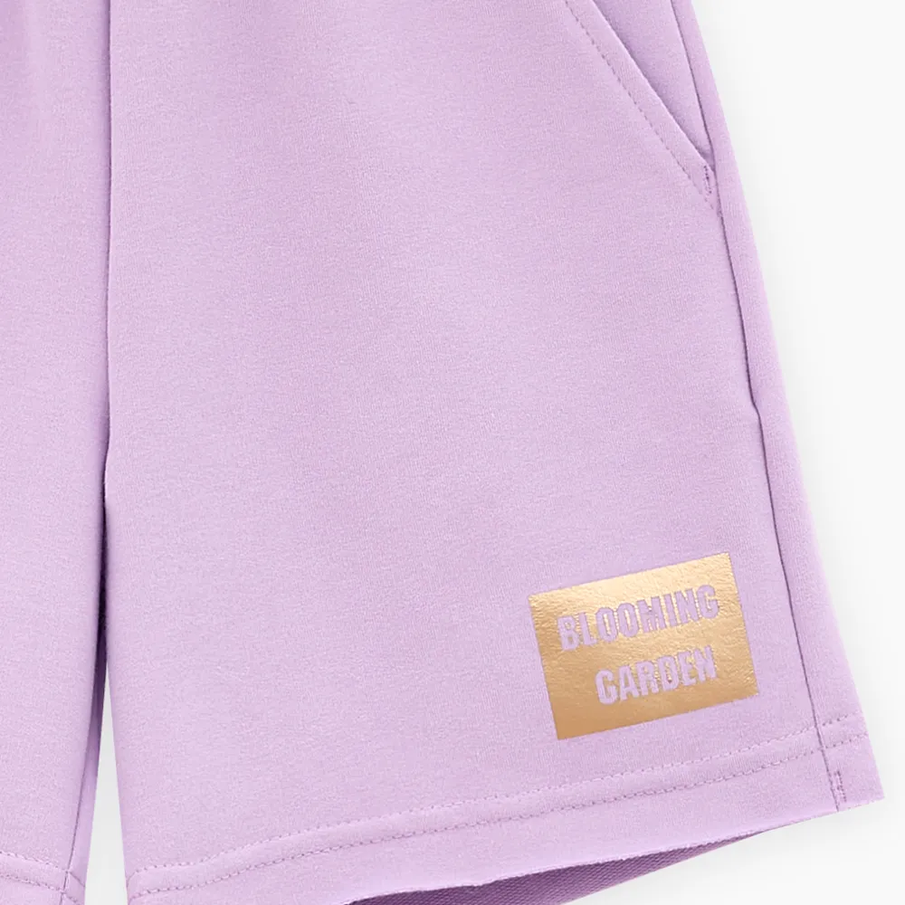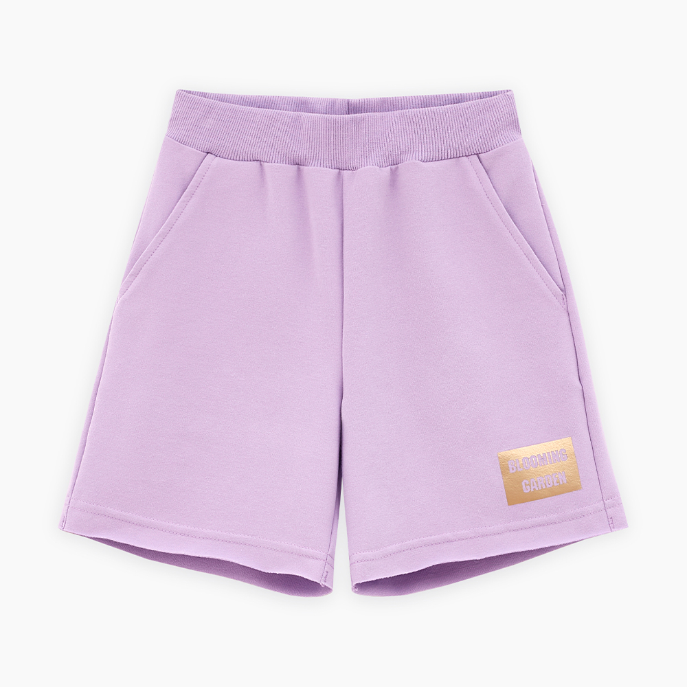 Шорты трендового лавандового оттенка для девочки. Прямая модель. Изделие на мягком эластичном поясе, со средней посадкой. Шорты из тактильно приятного футера дополнены карманами-хулиганами.