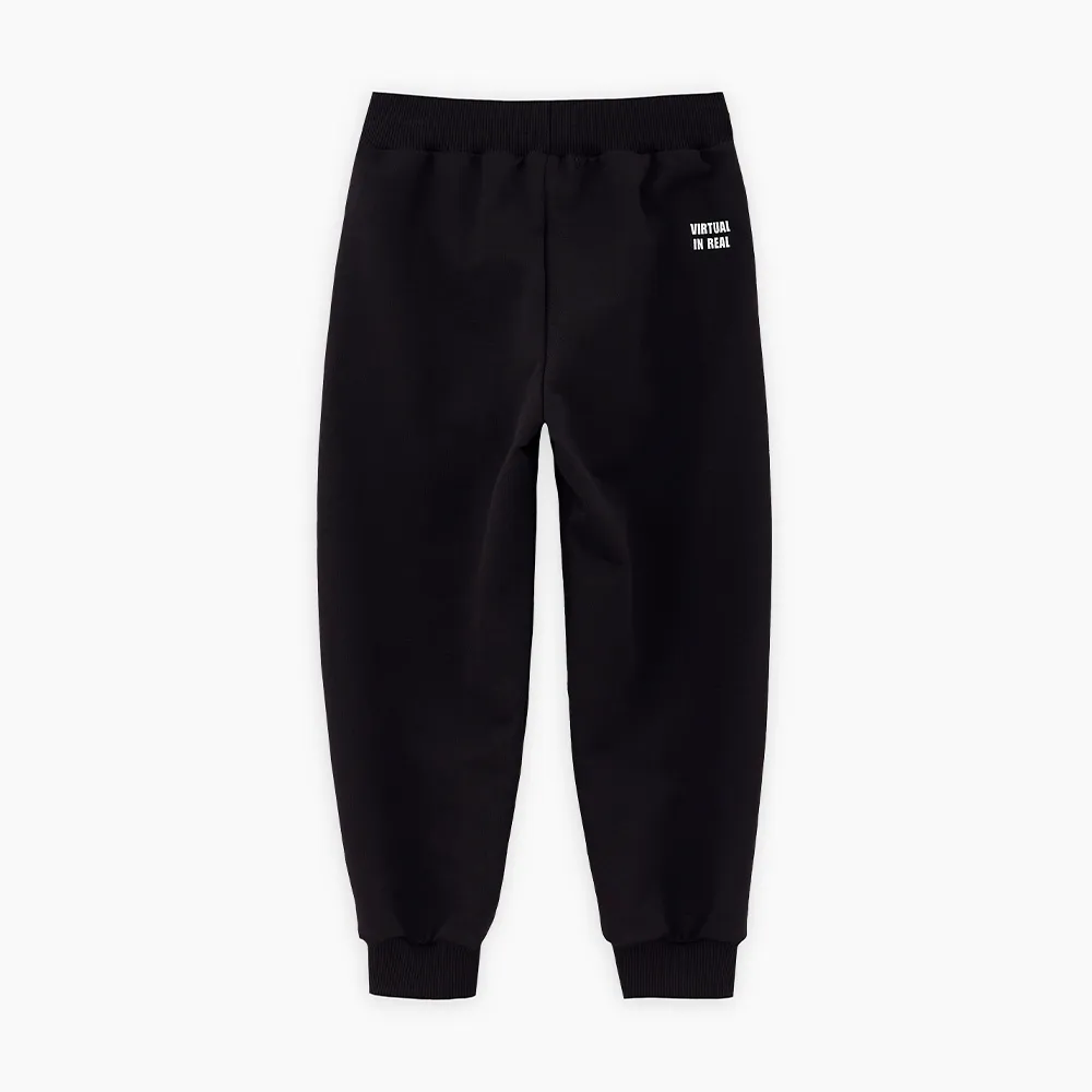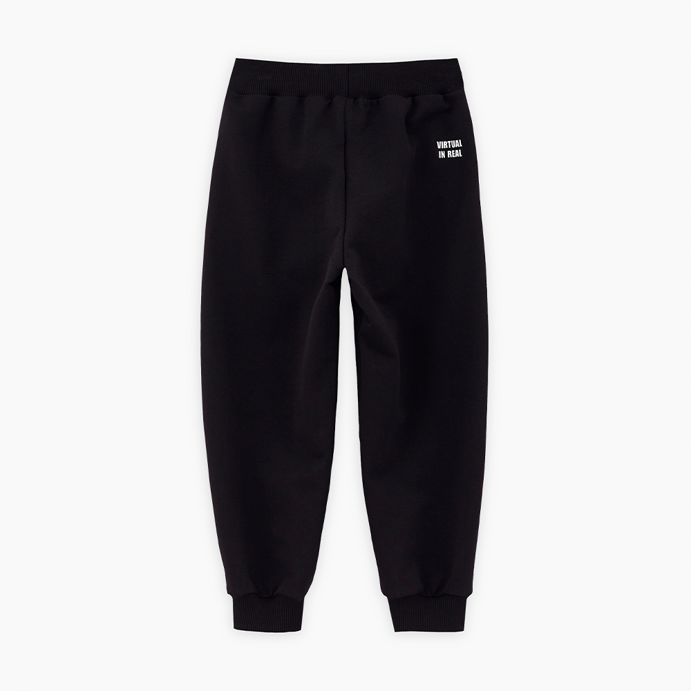 Комфортные чёрные брюки-джоггеры из футера для мальчика. Прямая модель, со средней посадкой. Мягкий эластичный пояс и манжеты. Модель дополнена лаконичным авторским принтом сзади.