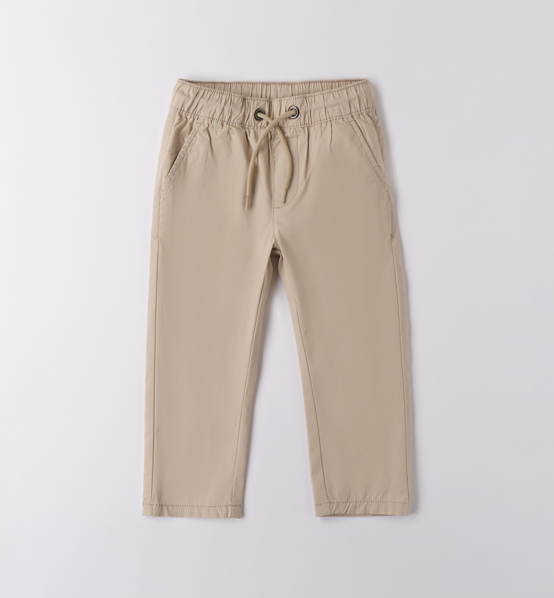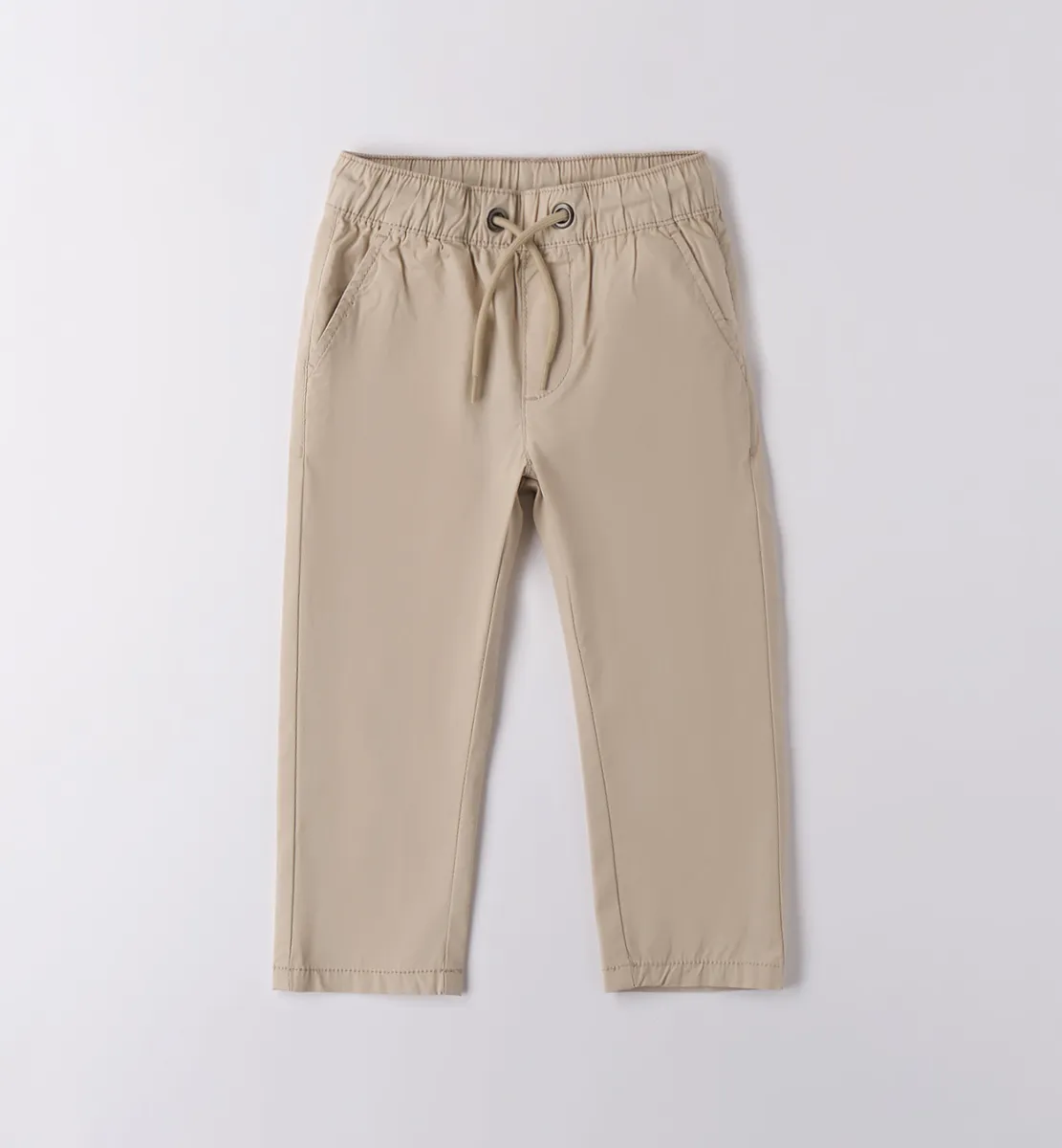 Удобные и практичные брюки для мальчика песочного цвета. Модель имеет прямой крой и эластичный пояс на кулиске для регулировки посадки. Спереди расположены два врезных кармана.