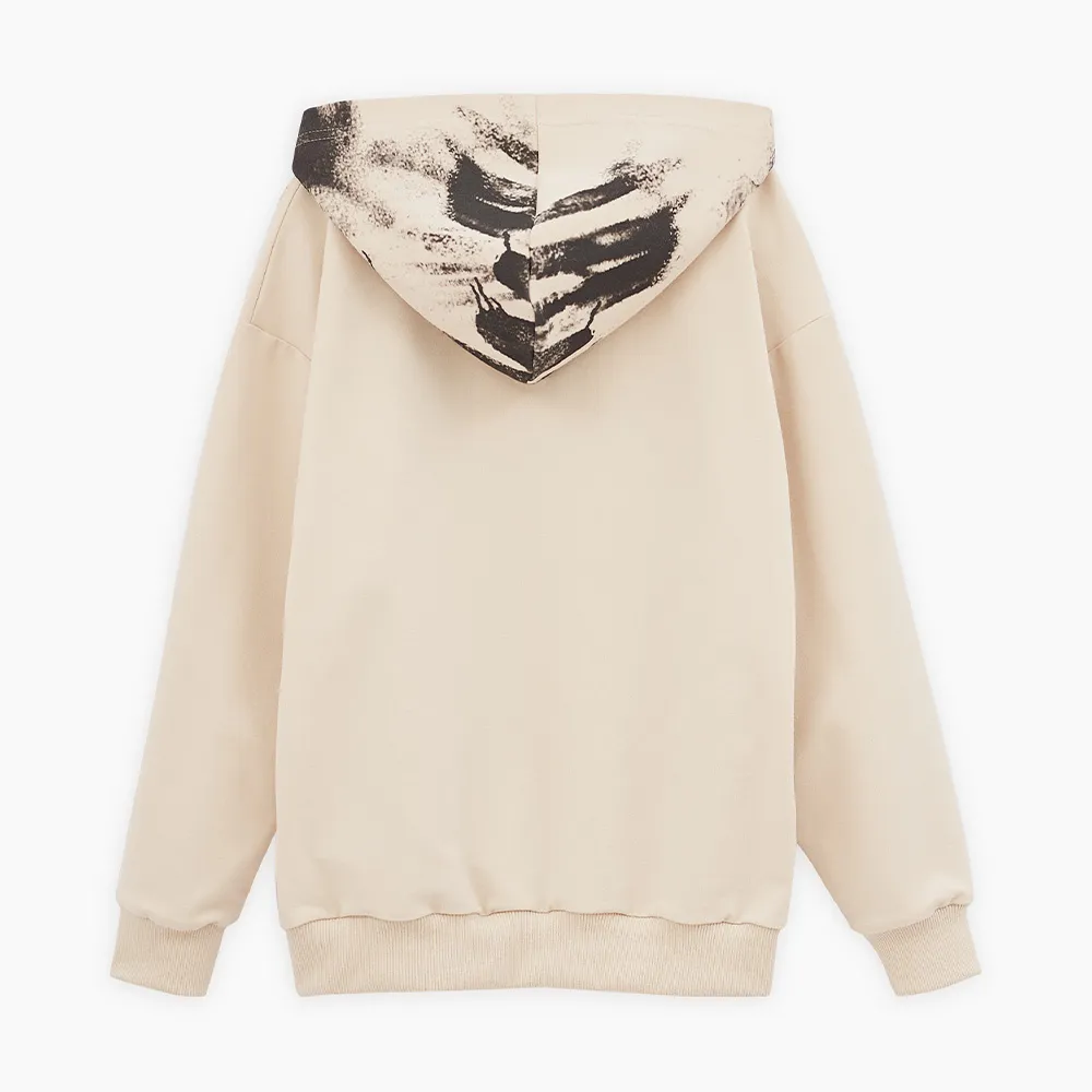 Комфортное худи светло-бежевого оттенка для мальчика. Прямая модель. Глубокий капюшон. Спущенная линия плеча. Эластичные манжеты и низ изделия из рибаны. Худи из тактильно приятного материала. Акцентный принт в стиле граффити.