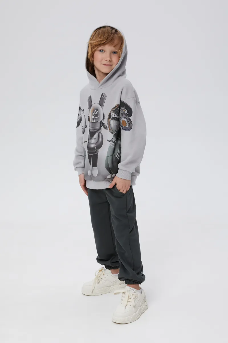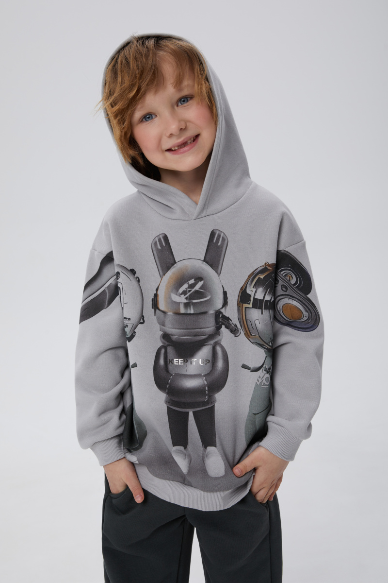 Худи оттенка серая дымка. Модель прямого объёмного силуэта с глубоким капюшоном. Приспущенная линия плеча. Манжеты и низ изделия из эластичной рибаны. Худи из футера с бархатистым эффектом декорировано дизайнерским принтом, с использованием DTF печати.