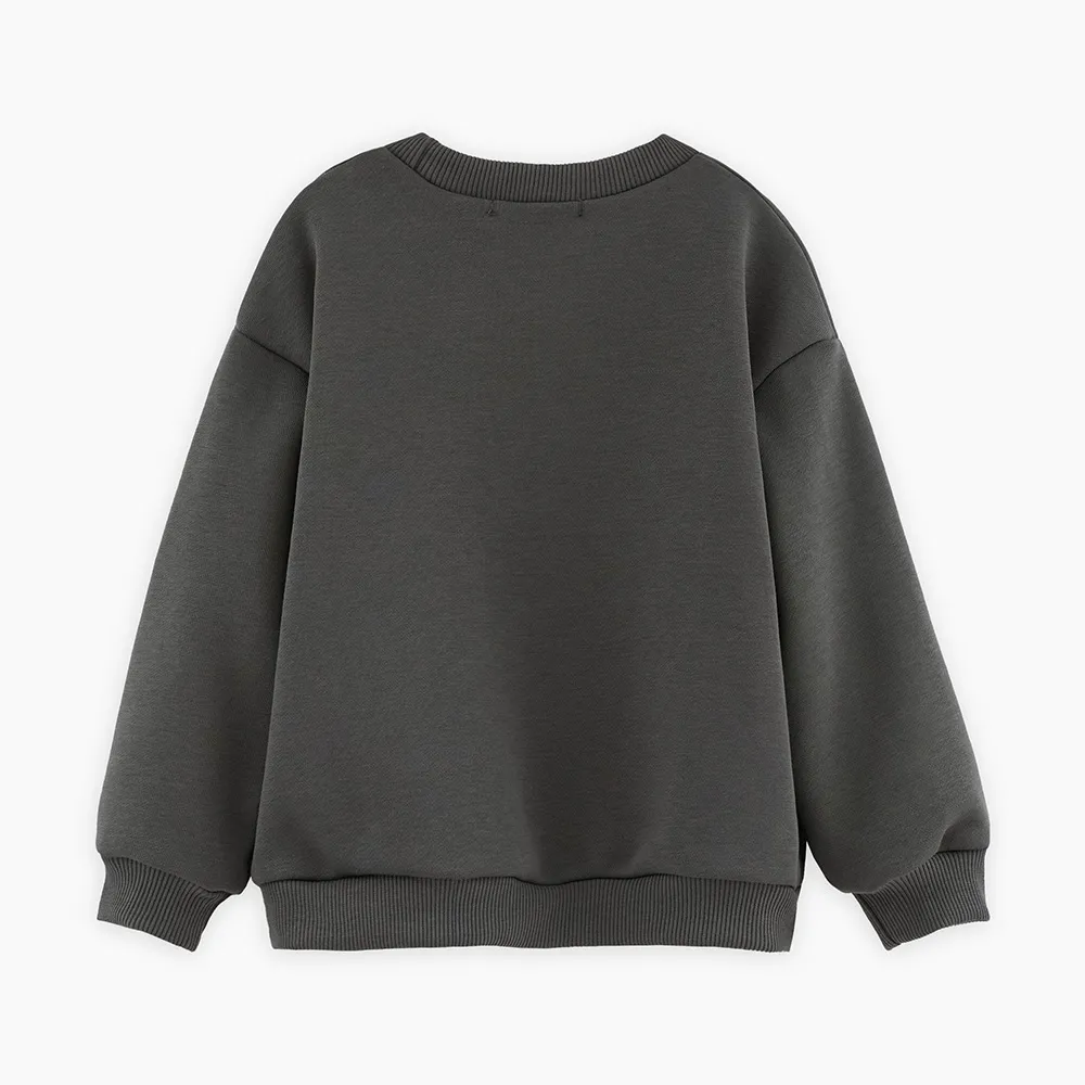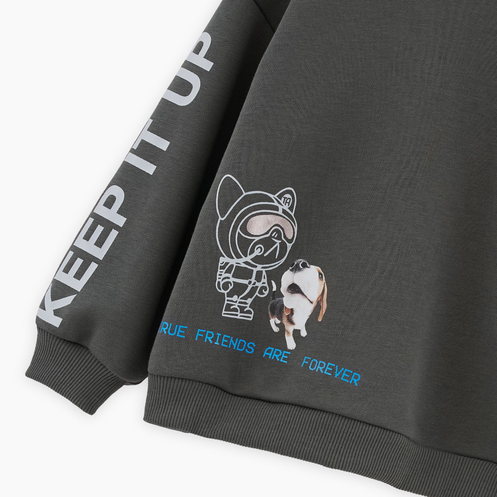 Базовый свитшот глубокого оттенка тёмный лес для мальчика. Модель прямого объёмного силуэта. Приспущенная линия плеча. Воротник, манжеты и низ изделия из рибаны. Свитшот декорирован авторскими принтами, с использованием DTF печати.