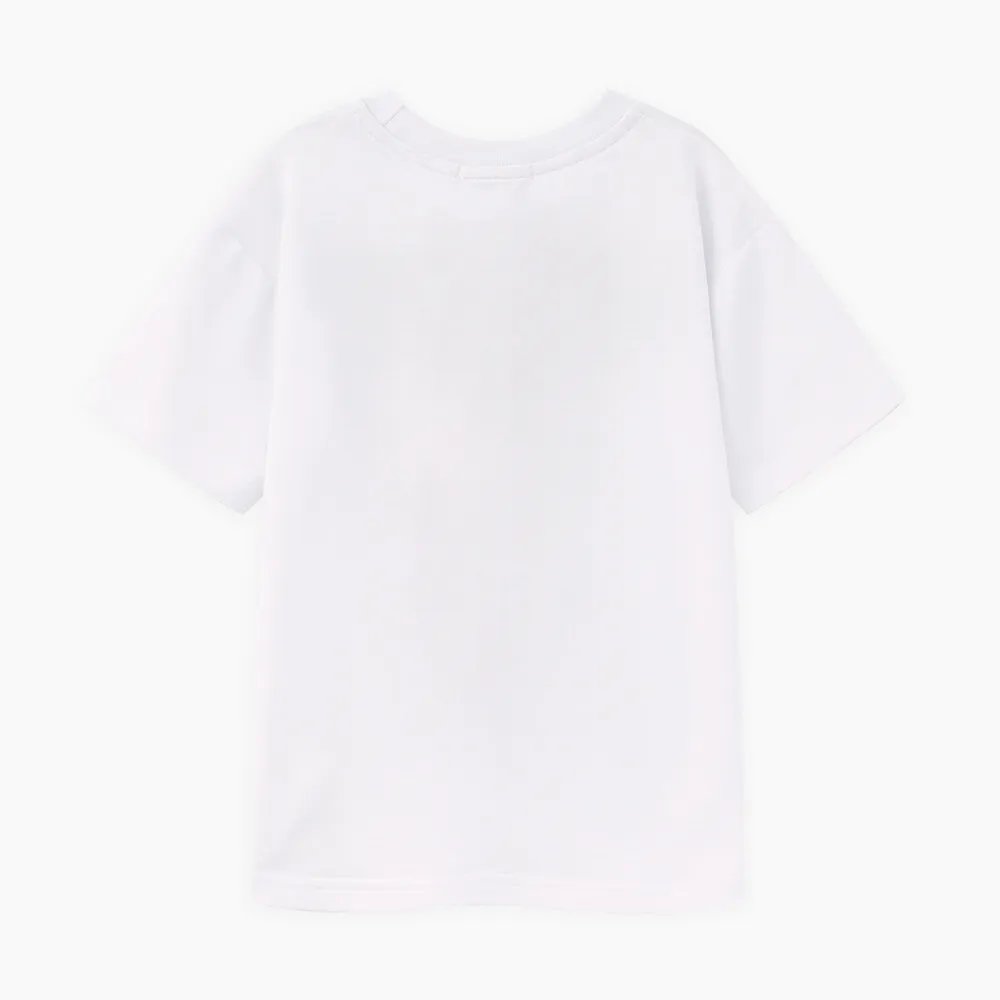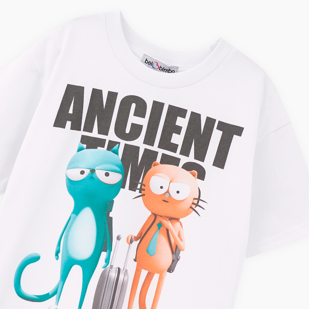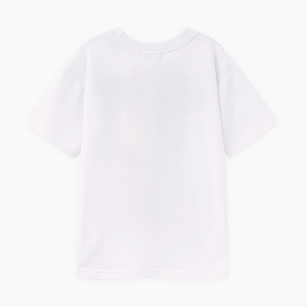 Дизайнерская белая футболка для мальчика. Модель комфортного прямого силуэта. Спущенная линия плеча. Эластичная горловина. Футболка с акцентным авторским принтом.
