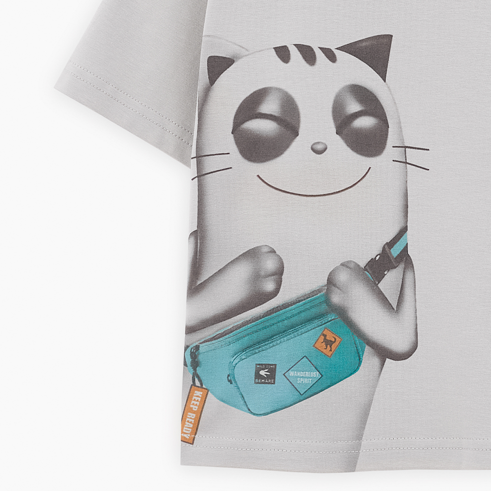 Дизайнерская футболка интересного серо-зелёного оттенка для мальчика. Прямая объёмная модель. Спущенная линия плеча. Эластичная горловина. Футболка с авторским принтом, безопасная и качественная трансферная печать.