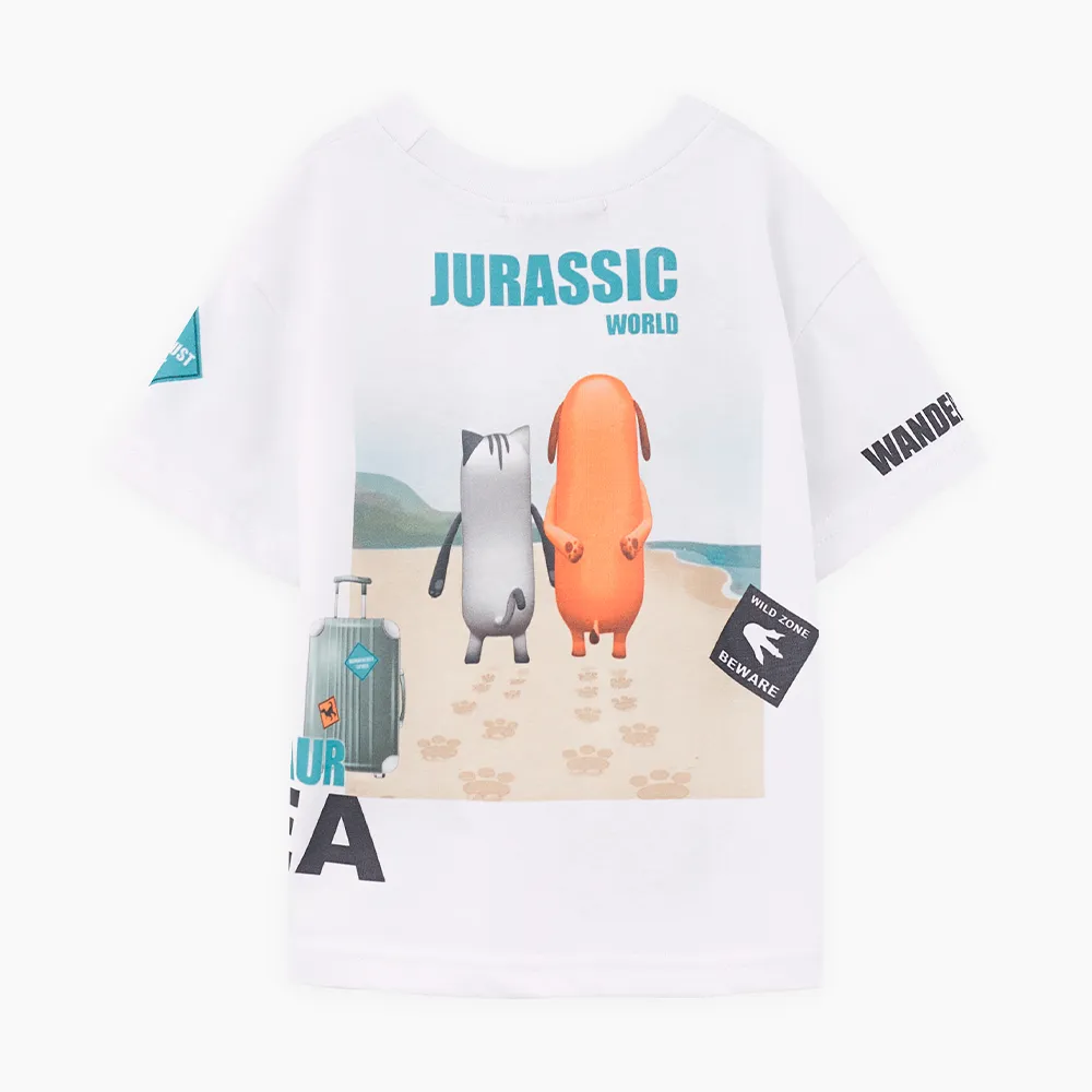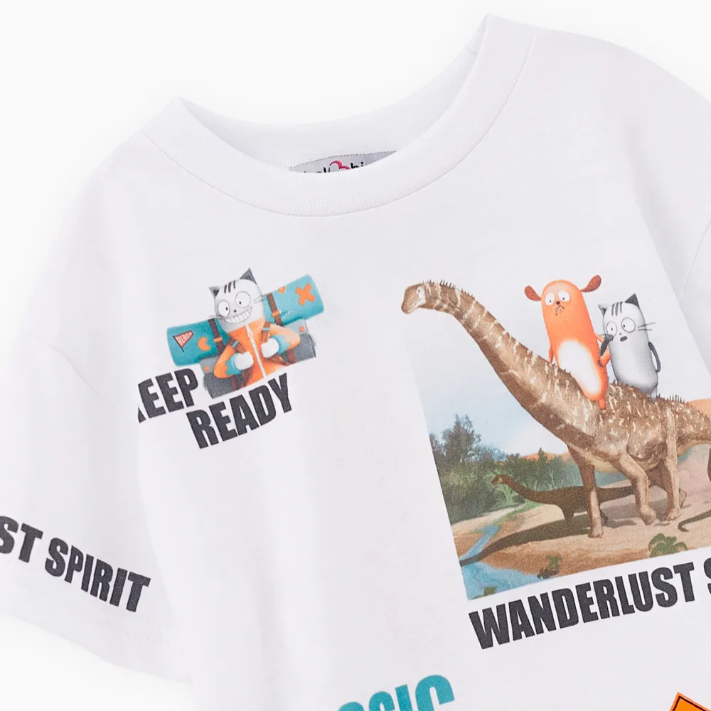 Дизайнерская белая футболка для мальчика. Прямая объёмная модель. Спущенная линия плеча. Эластичная горловина. Футболка с авторскими принтами по всему изделию.