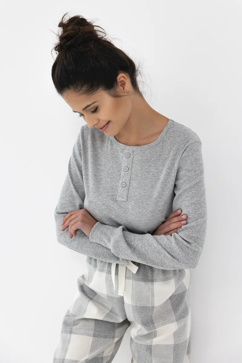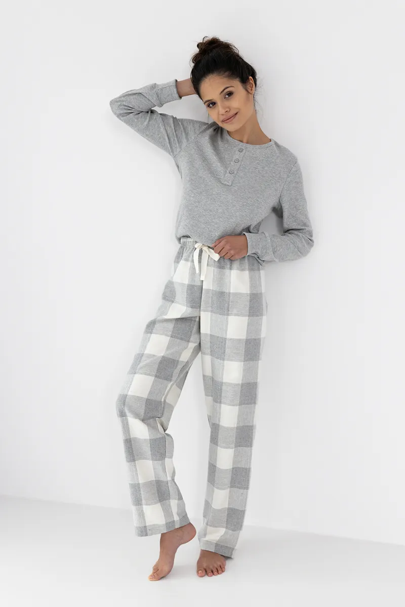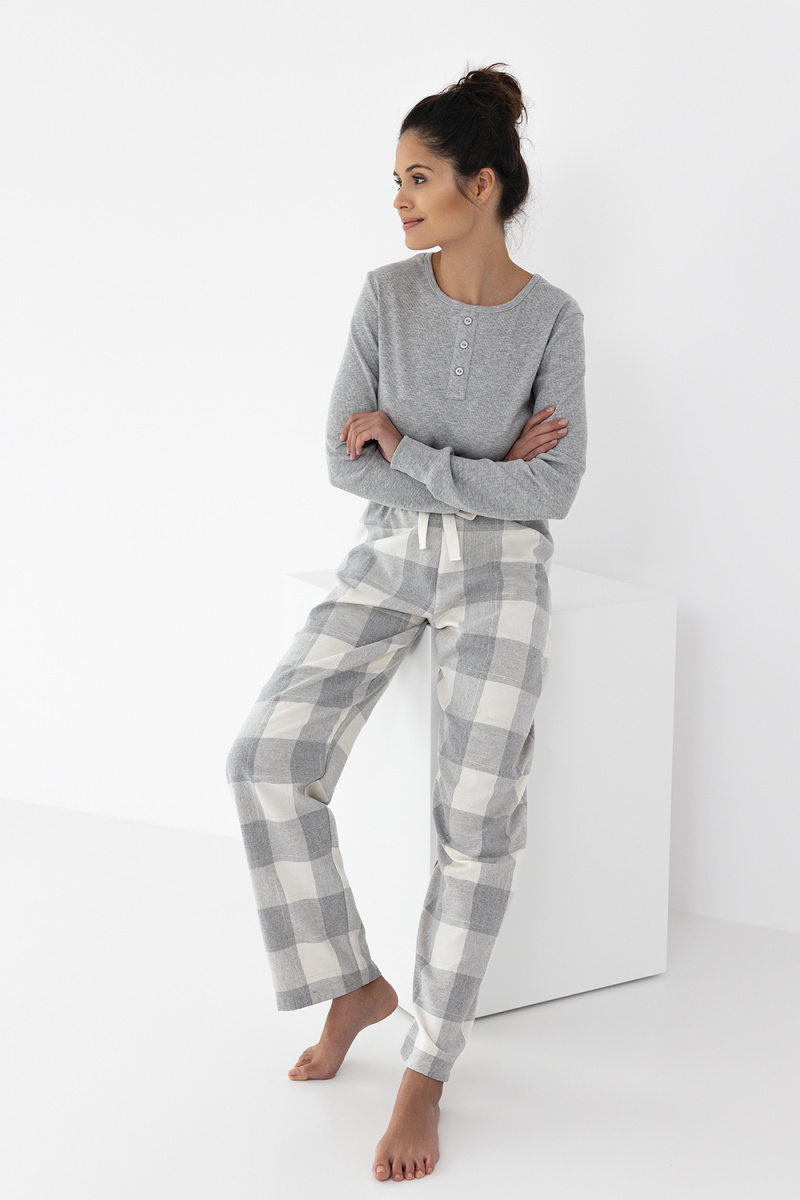 Пижама Vesper состоит из лонгслива с длинным рукавом и брюк в крупную клетку. Лонгслив с круглым вырезом горловины. Брюки прямые на широкой резинке. Брюки выполнены из хлопка 70%, полиэстер 29%, модал 1%. Идеальный вариант не только для сна, но и для домашнего отдыха.