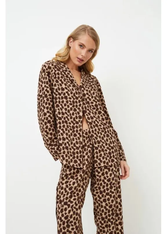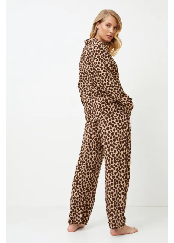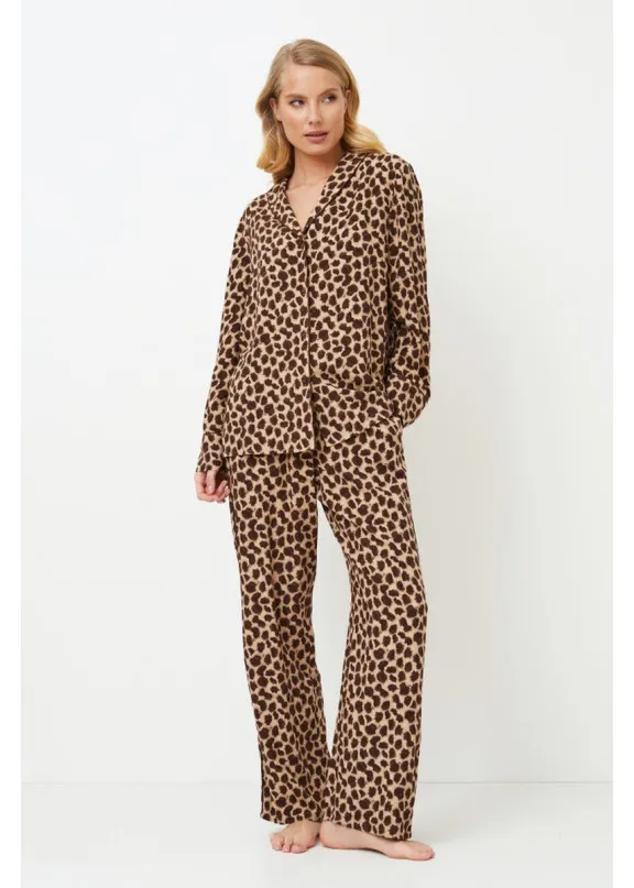 Представляем вашему вниманию длинную пижаму Susan с ярким леопардовым принтом, который внесет изюминку в ваш повседневный образ. Этот комплект выполнен из дышащей вискозы с эффектным леопардовым принтом. Топ с длинными рукавами, застегивающийся на пуговицы, и V-образным вырезом горловины. Длинные брюки в тон имеют карманы и украшены коричневой окантовкой по бокам. Наденьте длинную пижаму Susan и позвольте удобной ткани и увлекательному дизайну унести вас в мир романтики и расслабления. Пижама из текстильной вискозы.